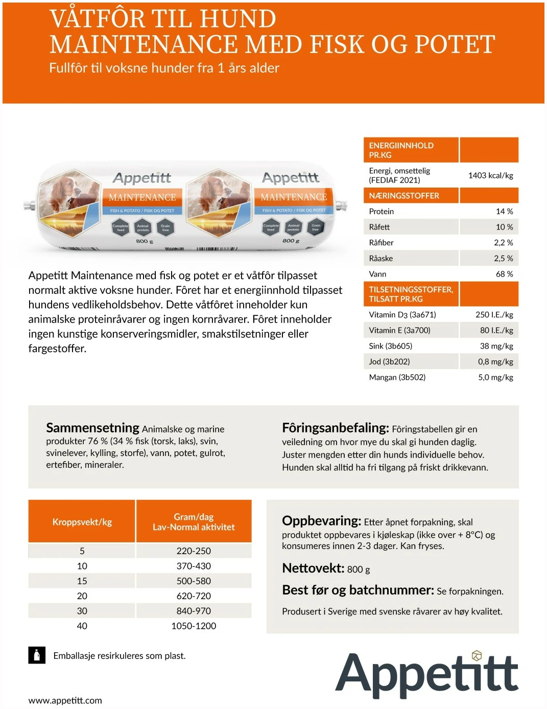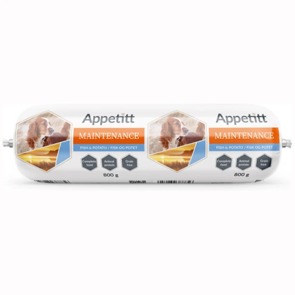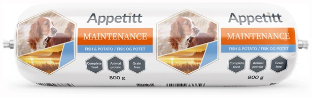 Appetitt Maintenance med fisk og potet er et våtfôr tilpasset normalt aktive voksne hunder over 1 år. Fôret har et energiinnhold tilpasset hundens vedlikeholdsbehov.