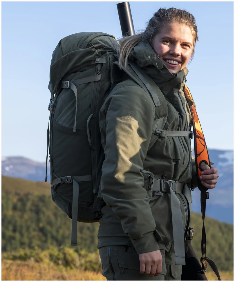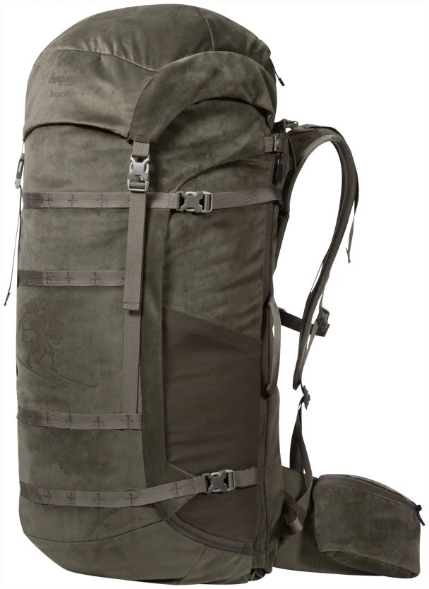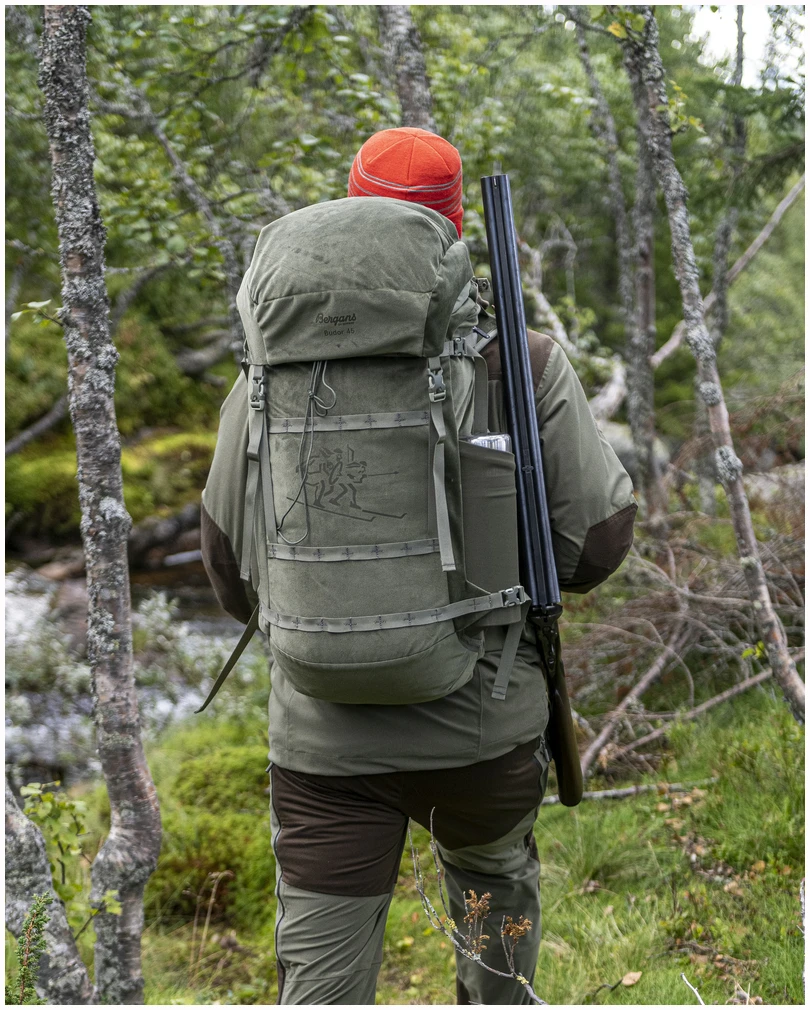 Full komfort med og uten børse. Budor V2 45 er en funksjonell sekk spesialdesignet for drivjakt. Polyestermaterialet, som er helt lydløst og mykt gir sekken en unik følelse. Med integrert våpenholder på baksiden av sekken, mellom selve sekken og Bergans justerbare Quick Adjust Pro-bæresystem. Det gir en balansert og komfortabel transport av våpenet. En kile med glidelås gjør det raskt og enkelt å løsne våpenet fra sekken, og den gjør det mulig å komprimere våpenholderen når den ikke er i bruk. Ryggsekken kommer nærmere ryggen for økt bærekomfort. Hel glidelåsåpning på siden gjør det enkelt å få tilgang til hovedrommet. Veldig nyttig når du må organisere utstyret raskt! Flate skulderremmer med god friksjon gir stødig og solid støtte til riflekolben. Budor V2 45 kommer med Bergans PLUS Modular-festesystem for tilleggsutstyr som for eksempel rypenett.