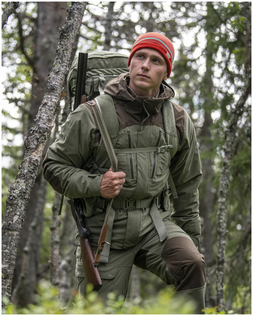 Bæresystem: Bergans Quick adjust Pro, justerbar rygglengde. Flate skulderremmer i myk polyester gir god friksjon og stødig anlegg for geværkolbe. Kurvet ryggsystem.