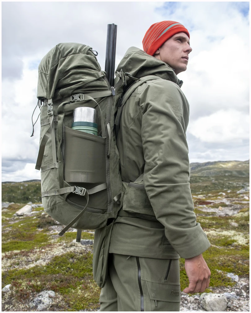 Ytterligere funksjoner: Bergans PLUS Modular-festesystem for tilleggsutstyr som for eksempel fuglenett (rypenett kjøpes separat). Kompresjonsremmer. Bærehåndtak på toppen og siden. YKK-glidelås. Produktet inneholder bluesign® approved trimmings.