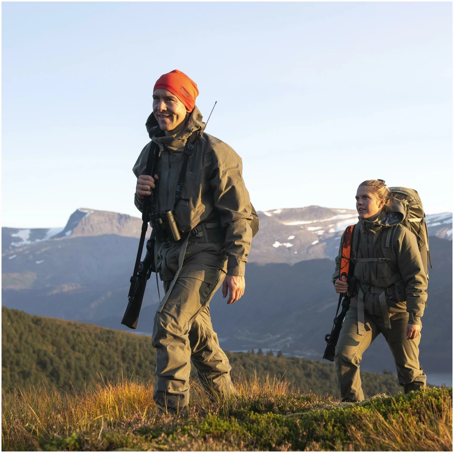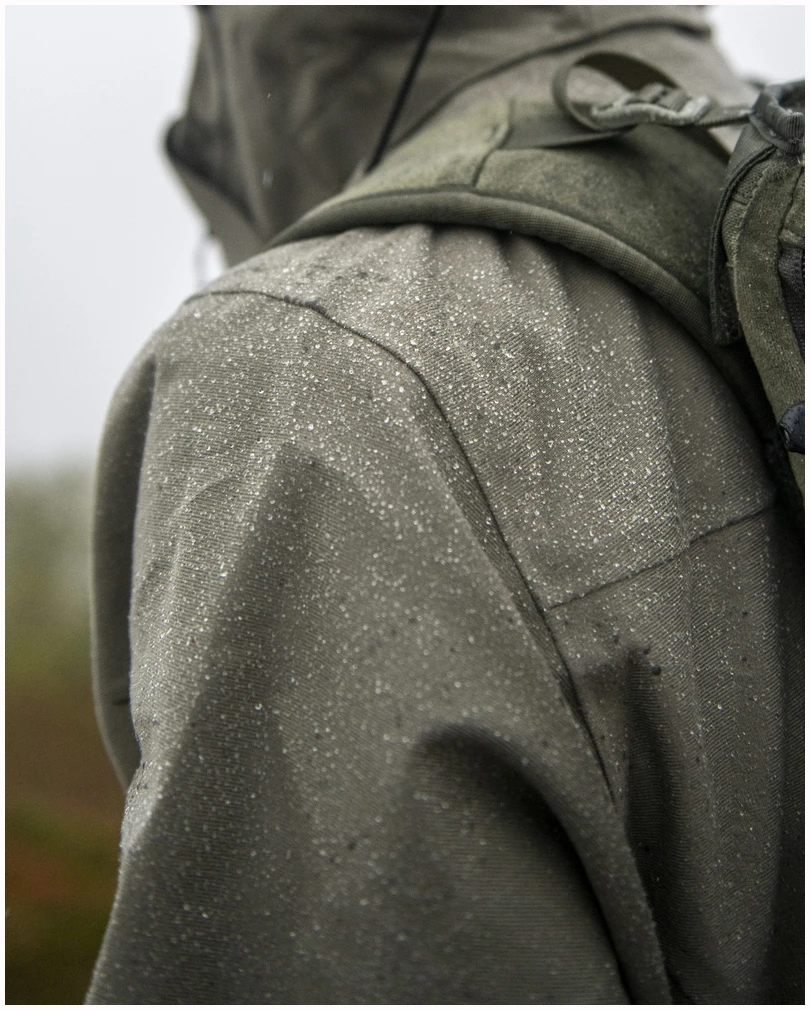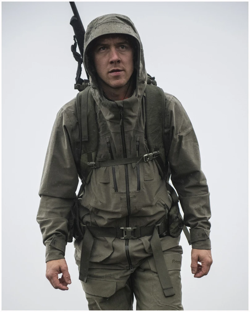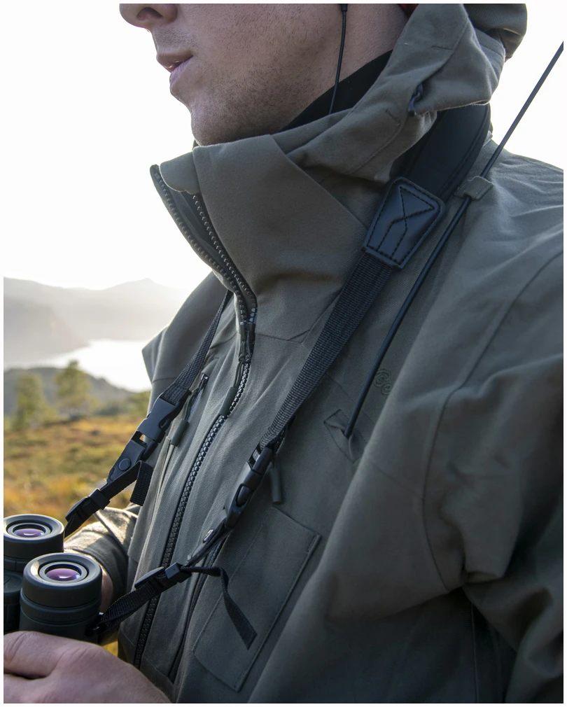 Alt ligger i detaljene! Hogna 3L Jacket har alt du kan ønske deg i et 3-lags skallplagg til jakt. Det første du legger merke til er materialet i børstet mikrotrikot med skjult justering, som sørger for helt lydløs bevegelse. Materialet er ikke bare utrolig mykt og komfortabelt å ha på seg, det er også svært værbeskyttende (vannsøyle min. 10 000 mm). Alle de små detaljene tilpasset jakt er selvsagt på plass: egne brystlommer til kommunikasjonsapparater med antenneuttak og hemper til å holde antennen på plass. Den samme lommen har også uttak for øretelefon med en elastisk hempe som holder øretelefonen på plass. For å forhindre at elektriske apparater blir fuktige på grunn av kondens fra kropps varme, er lommene vanntette fra innsiden. For at jakken skal fungere like godt for venstrehendte skyttere, har lommene de samme funksjonene på begge sider av brystet. Hvis du bruker en Garmin-holder, finner du festemuligheter til denne på forsiden av jakken. Når jakten blir intens og du trenger maksimum ventilasjon, finner du lange ventilasjonsglidelåser under ermene. Ventilasjonsglidelåsene er plassert på en slik måte at det er mulig å bruke jakken som en poncho.