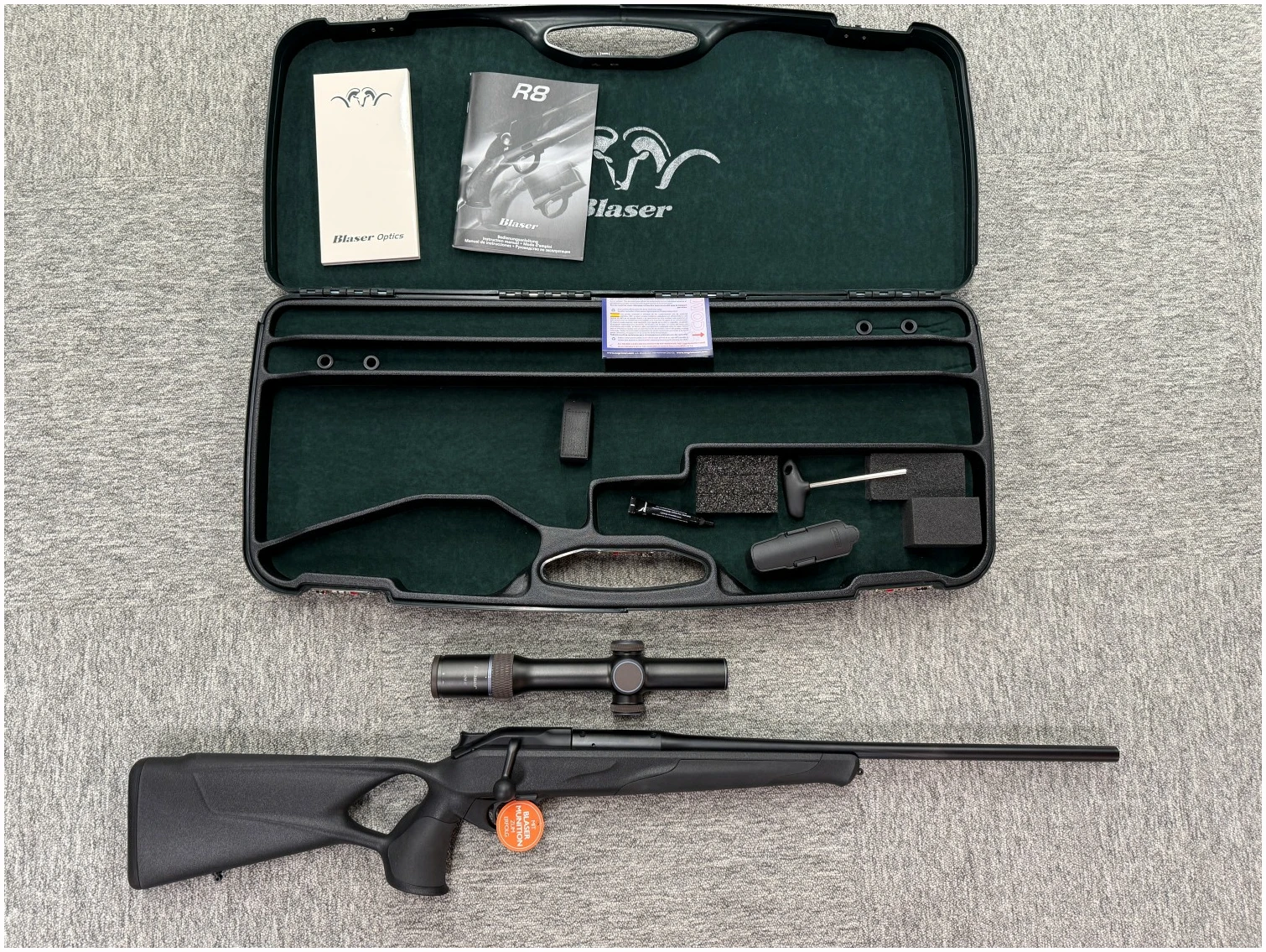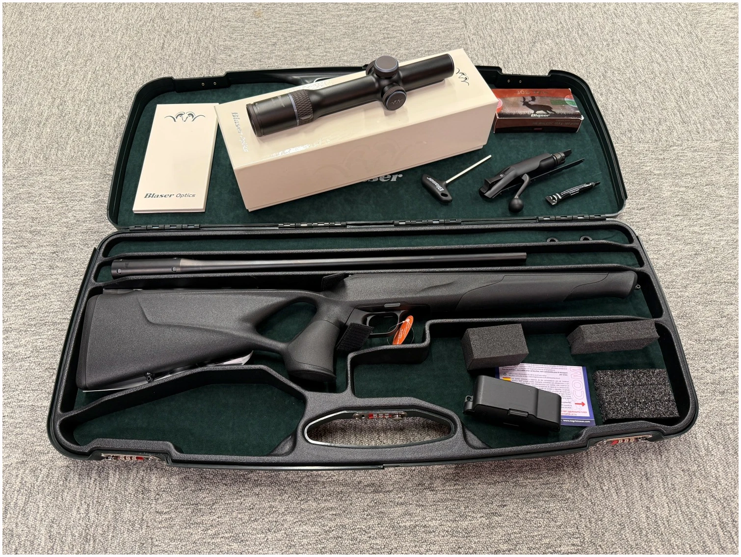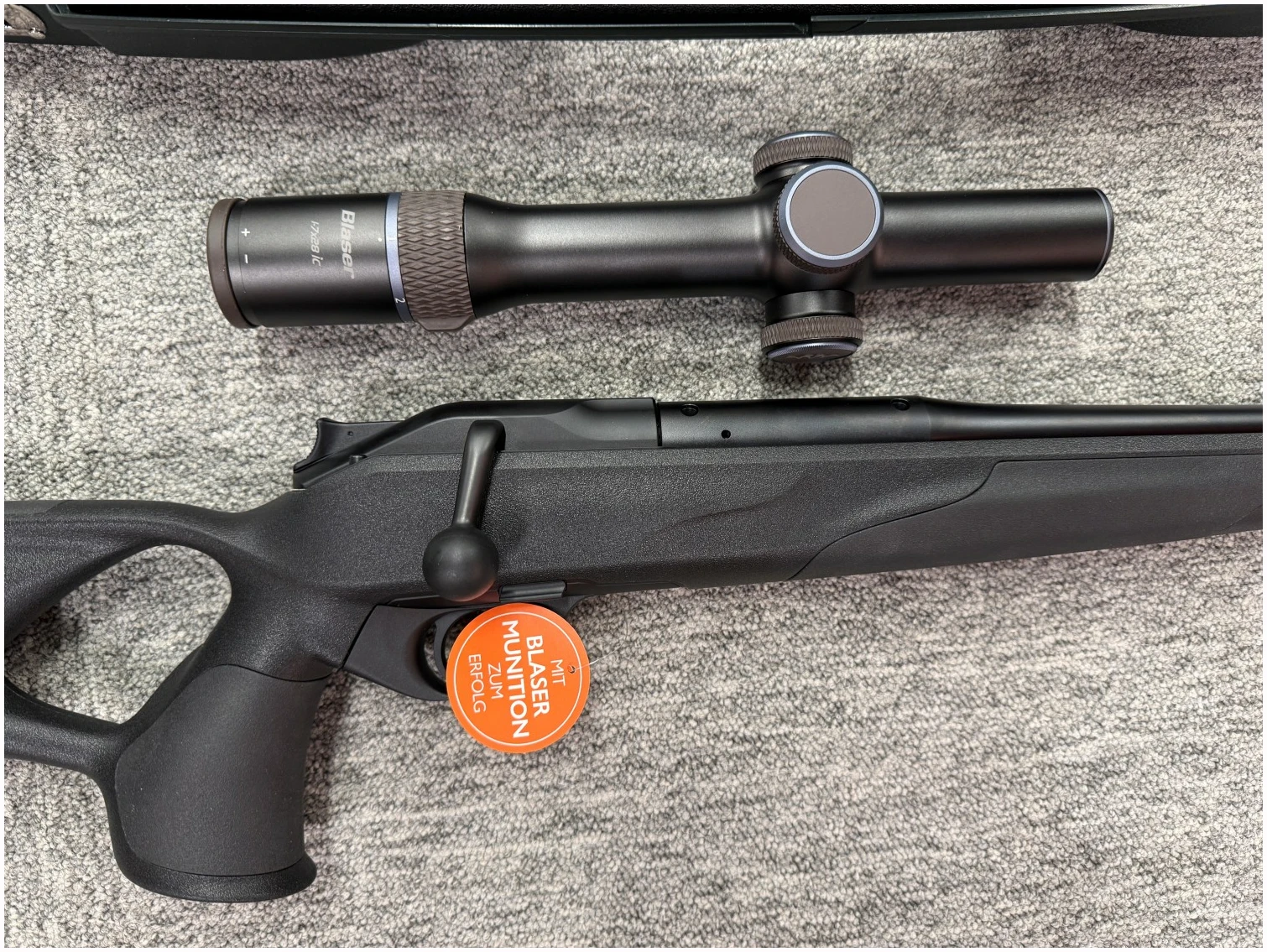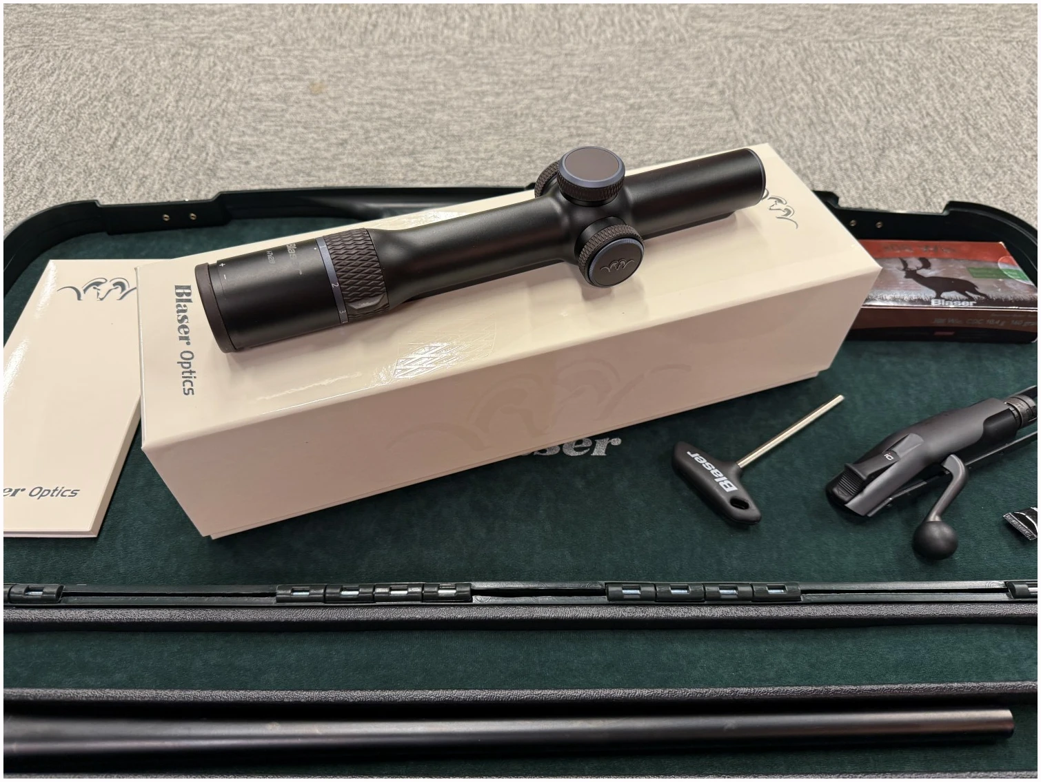 Pakken leveres med Blaser B1 1–7×28 IC montert på original Blaser skinnemontasje. Dette gir et ekstremt lavt og stabilt oppsett, perfekt for både drivjakt og smygjakt. Optikken gir krystallklart bilde, rask målanskaffelse og høy pålitelighet i skumring.