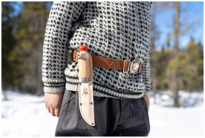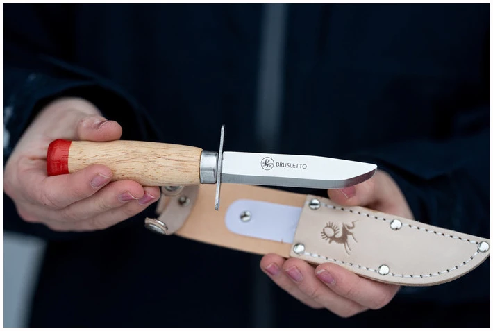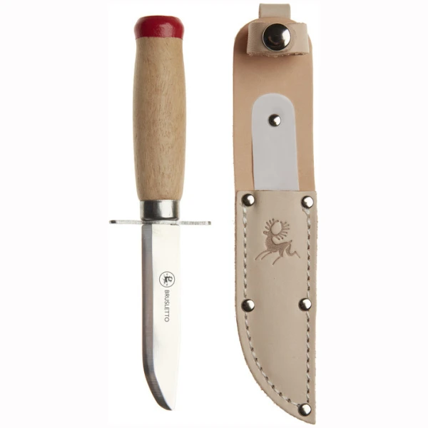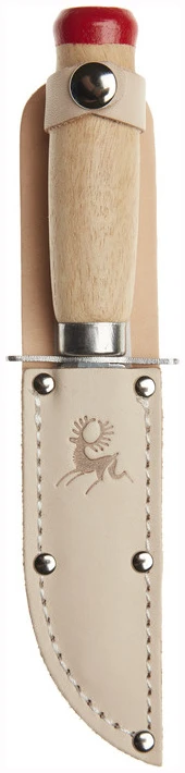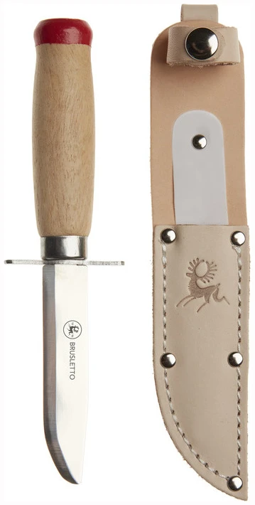 Speiderkniv med butt tupp. En kniv som er utviklet for de minste barna. Kniven har parergrep (fingerbeskytter) foran knivbladet. Knivens skaft er utformet slik, at den passer små hender og store hender (barn). Knivbladet er skandinavisk rett slipt med butt tupp. Knivbladet er 3Cr13 stål, som er lett å slipe opp igjen. Lakkert tre i skaftet. Kniven blir levert med en slire.