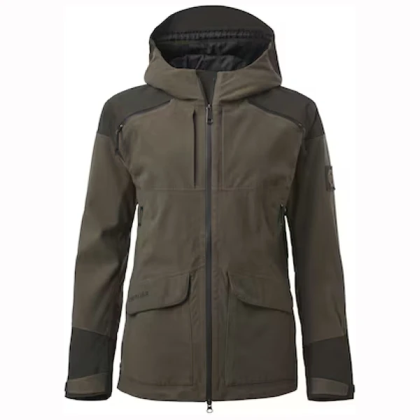 Pointer Chevalite Jacket 3.0 til dame er en støysvak og behagelig skalljakke i børstet stretchmateriale. Denne jaktjakken er vanntett og vindtett takket være vår Chevalite-membran og teiping av samtlige sømmer. Foran har jaktjakken en vannavvisende toveis glidelås fra YKK. Pointer 3.0-jakken har en rekke praktiske funksjoner, blant annet romslige, fleecefôrede hengelommer, belglommer med fleecefôr, doble radiolommer og en stor rygglomme. Inni jakken er det en innerlomme med glidelås til oppbevaring av nøkler og lignende. Denne skalljakken har svært gode luftemuligheter med toveis glidelås foran og glidelåser under begge armene. En trykknapp i falden foran holder forstykkene på plass selv om glidelåsen foran åpnes for lufting. Jakken er beregnet på aktivitet og bevegelighet med sitt myke stretchmateriale og sin ergonomiske passform med blant annet formsydde ermer. Den har forsterkning på skulder- og albuepartier. Vidden kan justeres på både fald og mansjetter. Jakken har en romslig hette med toveis justering som får hetten til å sitte tett rundt hodet med et enkelt enhåndsgrep. Hovedmaterialet og de to ulike fôrstoffene er laget av resirkulert polyester.