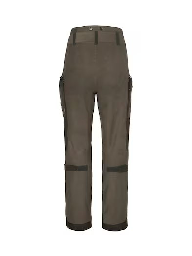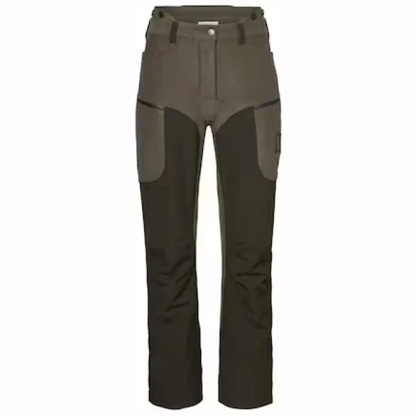 Pointer Chevalite Pants Women 3.0 er en støysvak og behagelig skallbukse i børstet stretchmateriale. Denne buksen er beregnet på jakt og utendørsaktiviteter. Konstruksjonen er vanntett og vindtett takket være vår Chevalite-membran og teiping av samtlige sømmer. Forsterkning i kontrastfarge foran og nederst på bena. Pointer 3.0-jaktbuksen har en ekstra høy linning som ligger behagelig mot ryggen. Dermed unngår du at det oppstår gliper, eller at buksen glir ned når du setter deg eller beveger deg i ulendt terreng. På utsiden av buksebena er det luftemuligheter i form av åpninger med glidelås. Linningen har både beltehemper og knapper til bukseseler. Pointer 3.0-buksen har praktiske og gjennomtenkte lommer, blant annet fleecefôrede håndlommer og romslige benlommer på begge sider. I høyre benlomme er det en mobillomme i netting, og i den venstre er det en elastisk patronholder. Buksen har en ergonomisk passform med formsydde knær og kan justeres under knærne og nederst på bena. En krok på innsiden av falden gjør det mulig å feste buksen til jaktstøvlene, slik at buksebenet ikke glir opp. Hovedmaterialet og de to ulike fôrstoffene er laget av resirkulert polyester.