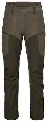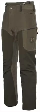 Buksen har en ergonomisk passform med formsydde knær og kan justeres under knærne og nederst på bena. En krok på innsiden av falden gjør det mulig å feste buksen til jaktstøvlene, slik at buksebenet ikke glir opp. Hovedmaterialet og de to ulike fôrstoffene er laget av resirkulert polyester.