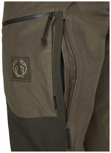 Konstruksjonen er vanntett og vindtett takket være vår Chevalite-membran og teiping av samtlige sømmer. Forsterkning i kontrastfarge foran og nederst på bena. Pointer 3.0-jaktbuksen har en ekstra høy linning som ligger behagelig mot ryggen. Dermed unngår du at det oppstår gliper, eller at buksen glir ned når du setter deg eller beveger deg i ulendt terreng.
