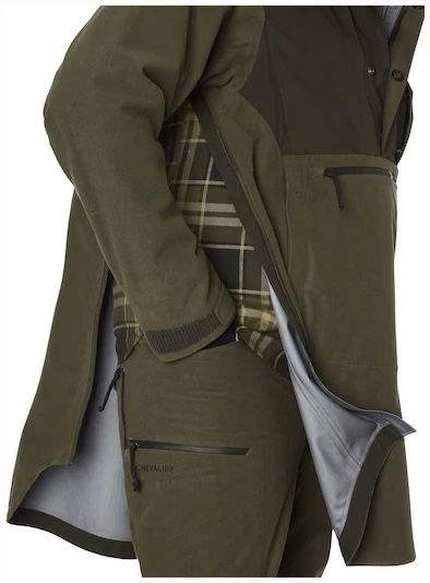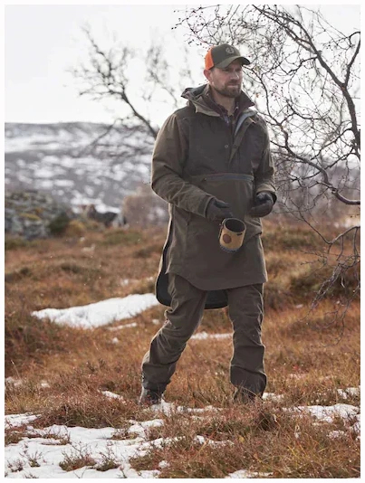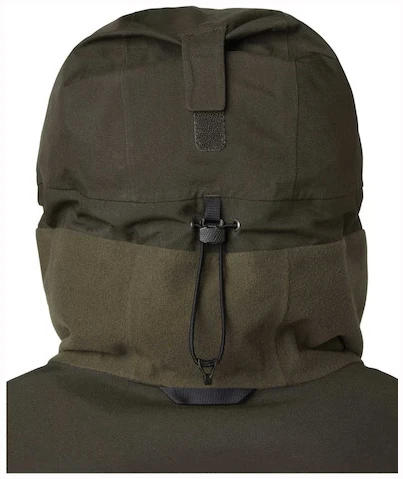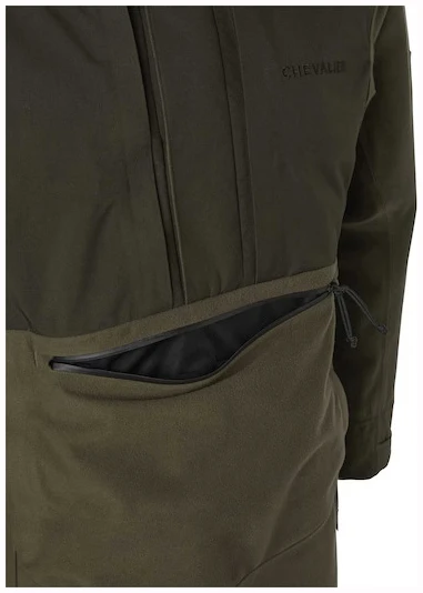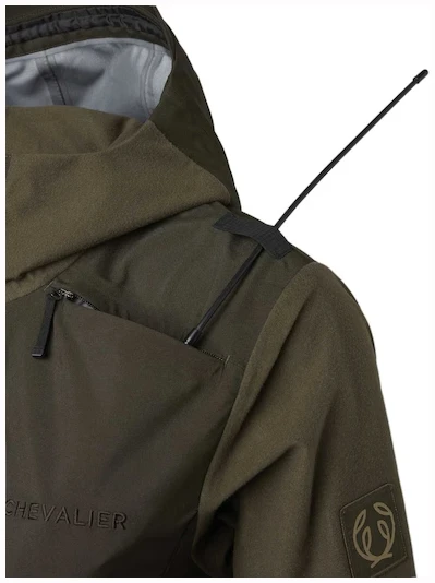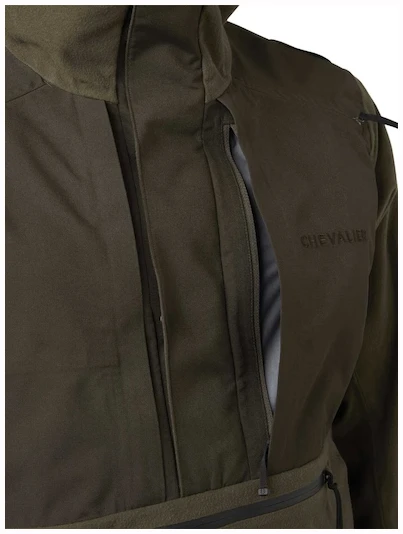 Foran har anorakken en glidelås skjult av doble frontklaffer som lukkes med stille trykknapper, perfekt for å unngå unødvendig støy under smygjakt. Anorakken har flate antenneløkker i et svært slitesterkt materiale på hver skulder. På brystet sitter doble radiolommer og to romslige glidelåslommer. På innsiden av radio- og brystlommene finnes gjennomganger for ledningen til øreproppen. Dette gjør at du kan føre ledningen på innsiden av plagget, slik at den ikke blir våt eller henger i veien foran ansiktet ditt.