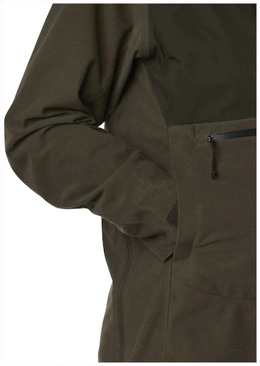 Plaggkonstruksjonen, kombinert med det vind- og vanntette PFAS-frie Chevalite-membranen og teipede sømmer, sikrer at du holder deg tørr i regnvær. Vannavvisningen på dette materialet er også PFAS-fri. Kontraststoffet på skulder- og brystpartiene er ekstra vannavvisende.