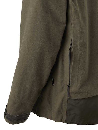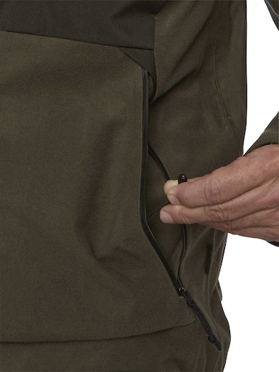 Pointer Pro Jacket Men har en rekke praktiske funksjoner, som en solid hette med toveis justering som gjør at hetten sitter tett rundt hodet med et enkelt enhåndsgrep. Hetteskjermen er ekstra forsterket for å gi god beskyttelse selv i hardt vær. Foran har denne jaktjakken en vannavvisende toveis glidelås fra YKK med en vindklaff bak. Under ermene finnes det store glidelåsventilasjonsåpninger.