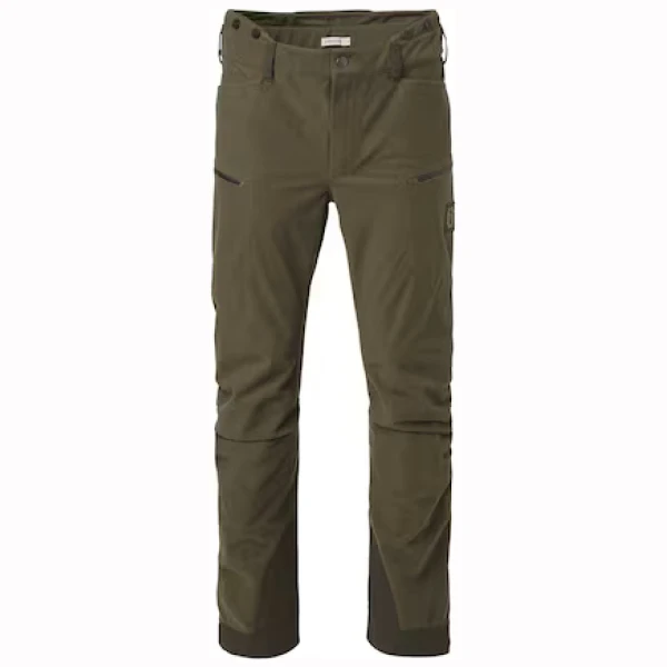 Denne jaktbuksen har en ergonomisk passform med forbøyde knær, og benvidden er justerbar med en borrelåsrem både under knærne og ved benavslutningene. Falden er forsterket med et ekstra slitesterkt materiale, og på innsiden er det en støvelkrok som gjør det mulig å feste buksefaldet til støvlene dine for å forhindre at buksebenet sklir opp.
