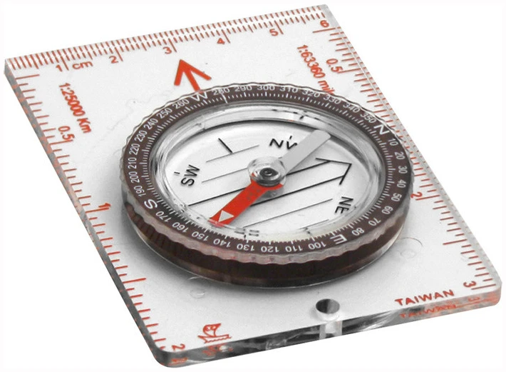 Med gjennomsiktig base og roterende, væskefylt hus. Basen har skala i tommer, millimeter og 1:25 000. Selvlysende retningspil.