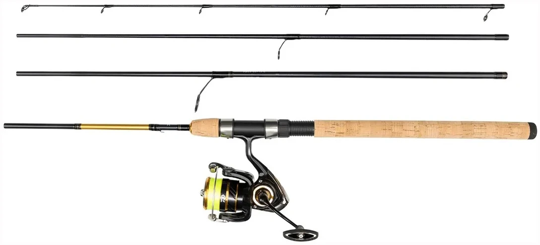 Den medfølgende 9 fots (ca. 270 cm) stangen er 4-delt, noe som gjør den enkel å transportere og ideell for turbruk. Med kastevekt på 5–25 gram passer settet perfekt til lettere slukfiske etter arter som ørret, abbor og lett predatorfiske.