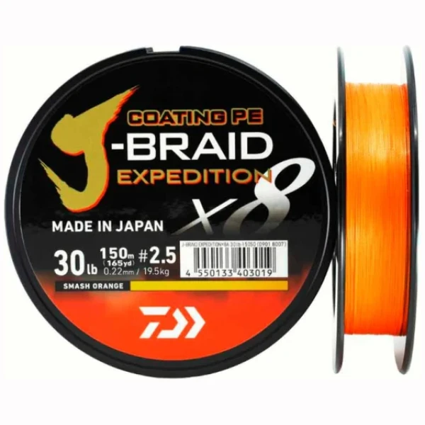 daiwa j-braid expedition x8e, fletteline 150m, smas h orange braid, dark green braid, 0.10 mm braid, 18 kg braid, round line