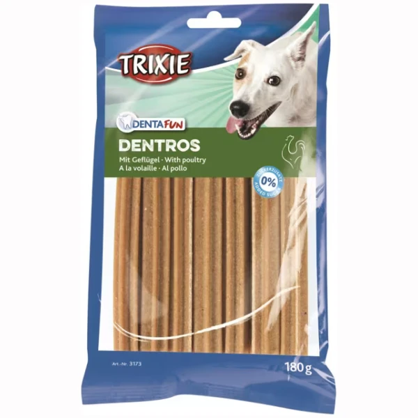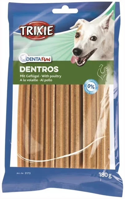 Dentros Light med fugl fra DentaFun er en velsmakende og lett godbit utviklet for å fremme bedre tannhelse hos hunder. Hver pakke inneholder 7 tyggepinner laget med smakfullt fjærkre, uten tilsatt sukker – et sunnere alternativ for daglig snacks eller belønning.