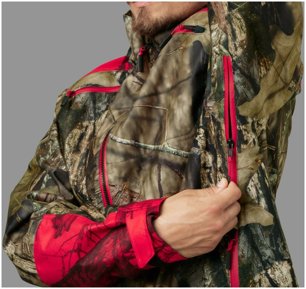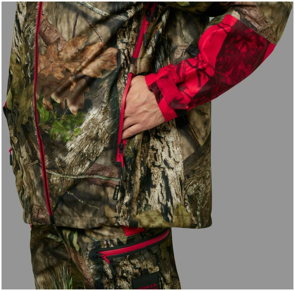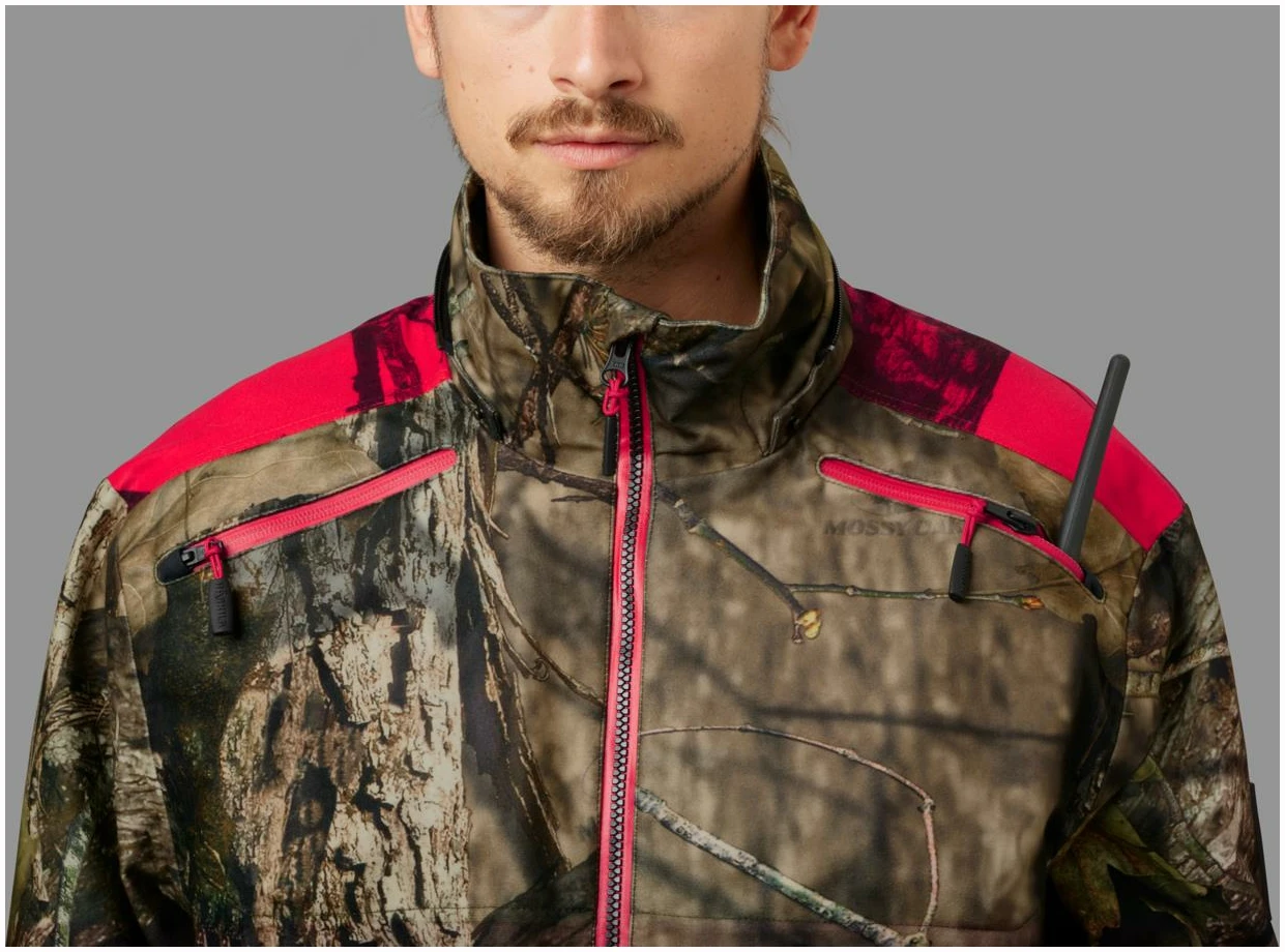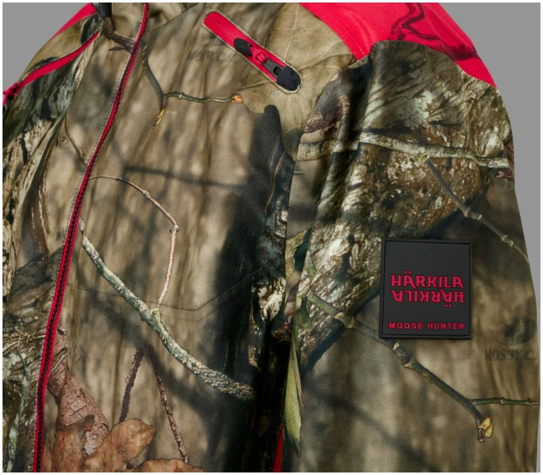 Moose Hunter 2.0 GTX-jakken er laget av et børstet trikotmateriale som både er mykt og lydløst, og som dermed gjør det lettere å snike seg helt innpå viltet. Jakken har en pustende og slitesterk tolags GORE-TEX-membran, som holder selv kraftig vind og regn ute. Innvendig sørger meshfôret for å transportere fuktigheten vekk fra kroppen og sikrer god komfort ved høy aktivitet. Stoffet har i tillegg fått en smuss- og vannavvisende Durable Water Repellent-behandling. I likhet med de andre delene i Moose Hunter 2.0-serien har jakken en kombinasjon av Mossy Oak® Break-Up Country®- og den nye Mossy Oak® Red-kamuflasjen. Klauvvilt er rød/grønn-fargeblinde, og den nye Mossy Oak® Red-kamuflasjen sikrer i større grad enn tidligere utgaver av blaze-kamuflasje at jegeren er kamuflert for viltet, men samtidig langt mer synlig for andre jegere. Jakken har store forlommer med glidelås og radiolommer på begge sider av brystet. Ventilasjonsglidelåser under armene gir luftemuligheter ved høy aktivitet. Moose Hunter 2.0 GTX-jakken har toveisglidelås, mansjetter som enkelt kan strammes og løsnes med én hånd, og regulering med elastisk snøring i hetten og nederst.