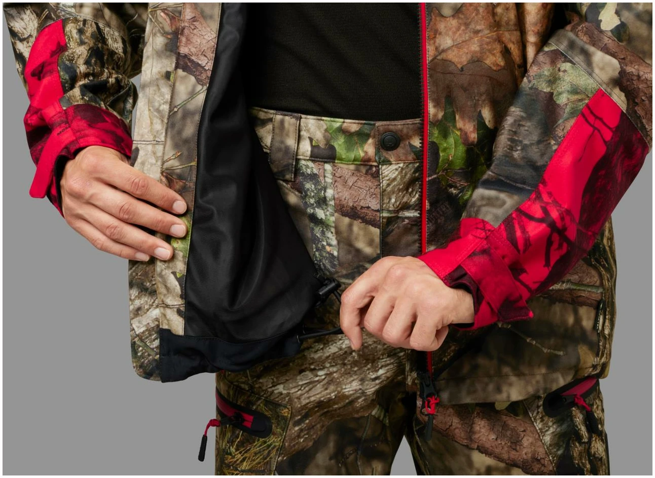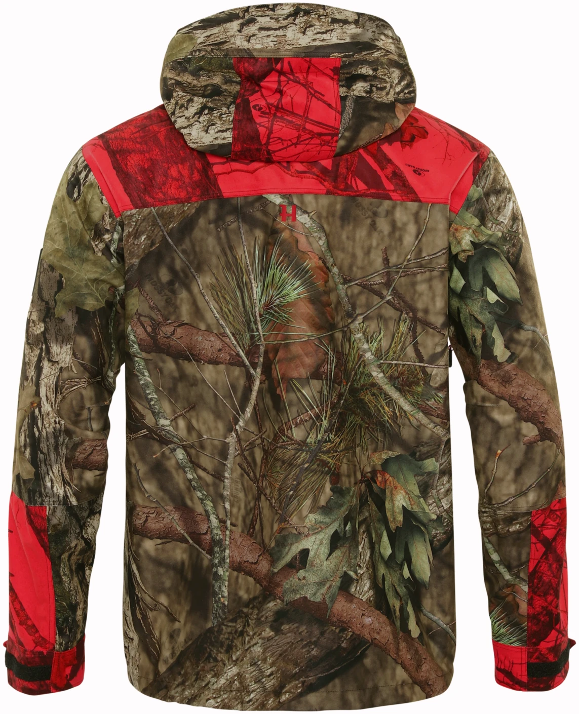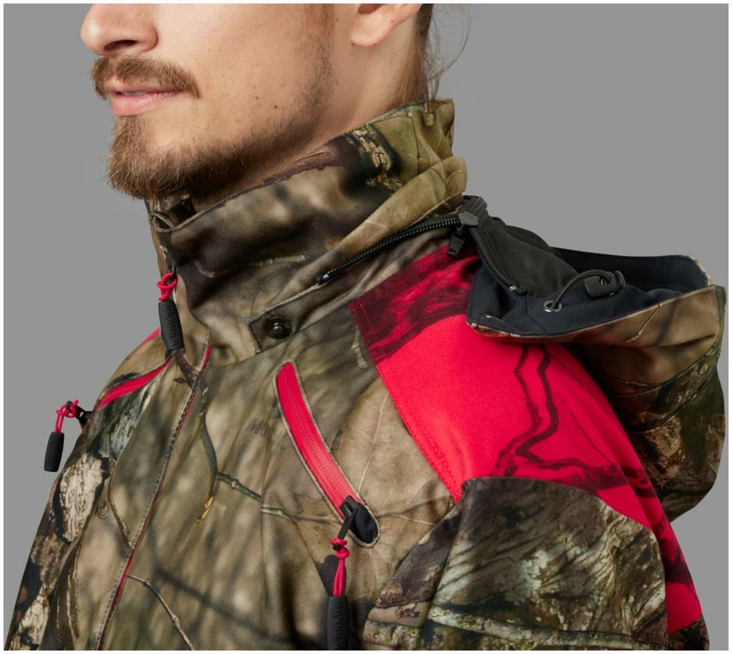 Moose Hunter 2.0 GTX-jakken er laget av et børstet trikotmateriale som både er mykt og lydløst, og som dermed gjør det lettere å snike seg helt innpå viltet. Jakken har en pustende og slitesterk tolags GORE-TEX-membran, som holder selv kraftig vind og regn ute. Innvendig sørger meshfôret for å transportere fuktigheten vekk fra kroppen og sikrer god komfort ved høy aktivitet. Stoffet har i tillegg fått en smuss- og vannavvisende Durable Water Repellent-behandling. I likhet med de andre delene i Moose Hunter 2.0-serien har jakken en kombinasjon av Mossy Oak® Break-Up Country®- og den nye Mossy Oak® Red-kamuflasjen. Klauvvilt er rød/grønn-fargeblinde, og den nye Mossy Oak® Red-kamuflasjen sikrer i større grad enn tidligere utgaver av blaze-kamuflasje at jegeren er kamuflert for viltet, men samtidig langt mer synlig for andre jegere. Jakken har store forlommer med glidelås og radiolommer på begge sider av brystet. Ventilasjonsglidelåser under armene gir luftemuligheter ved høy aktivitet. Moose Hunter 2.0 GTX-jakken har toveisglidelås, mansjetter som enkelt kan strammes og løsnes med én hånd, og regulering med elastisk snøring i hetten og nederst.