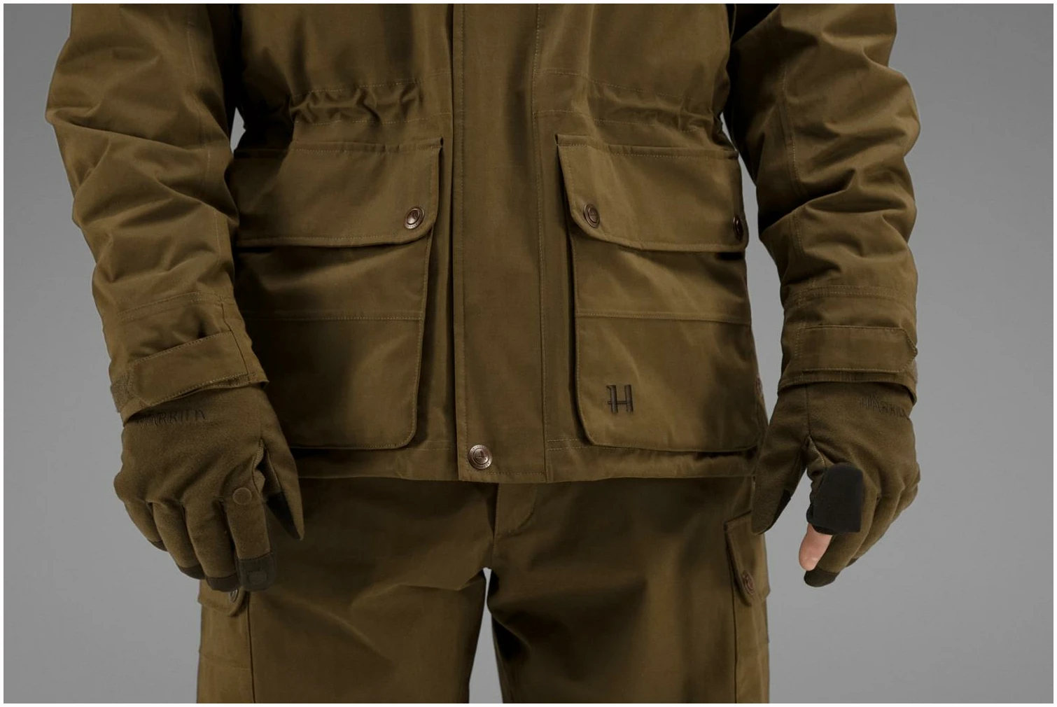 Retrieve-hanskene er laget av et mykt og hurtigtørkende materiale og utstyrt med en vind- og vanntett HWS-membran (Härkila Weather System). Stoffet er DWR-behandlet (Durable Water Repellent), slik at hanskenes ytterside er smuss- og vannavvisende.