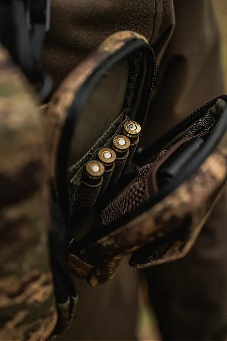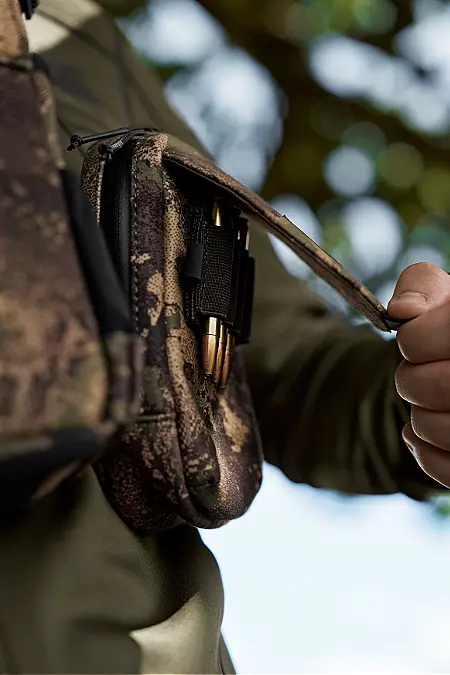 Kompletter Härkila Camo Bino Harness med den allsidige Utility Pouch i stillegående AXIS MSP® Forest camo, perfekt til oppbevaring av viktige gjenstander som ammunisjon, førstehjelpsutstyr eller en powerbank. Posen har en vannavvisende glidelås med dobbel lukking, en innvendig nettinglomme og en avtakbar patronholder for organisert oppbevaring. MOLLE-stagene gjør det mulig å feste vesken modulært til selen, mens det sammenleggbare dekselet har lydløse magnetlukninger som beskytter patronene når de bæres utenfor hovedrommet.