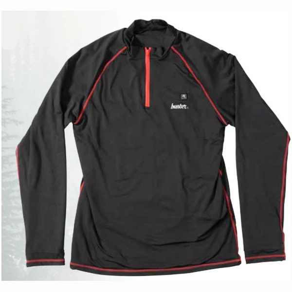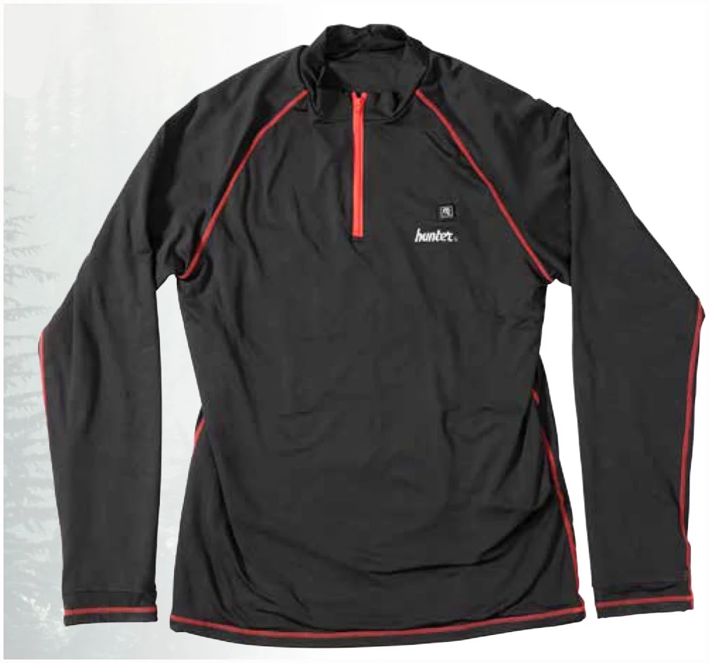 Hunters termoskjorte er utstyrt med tre varmepaneler som reguleres med ved hjelp av en trykknapp på brystet og du kan velge mellom tre forskjellige temperaturer.
