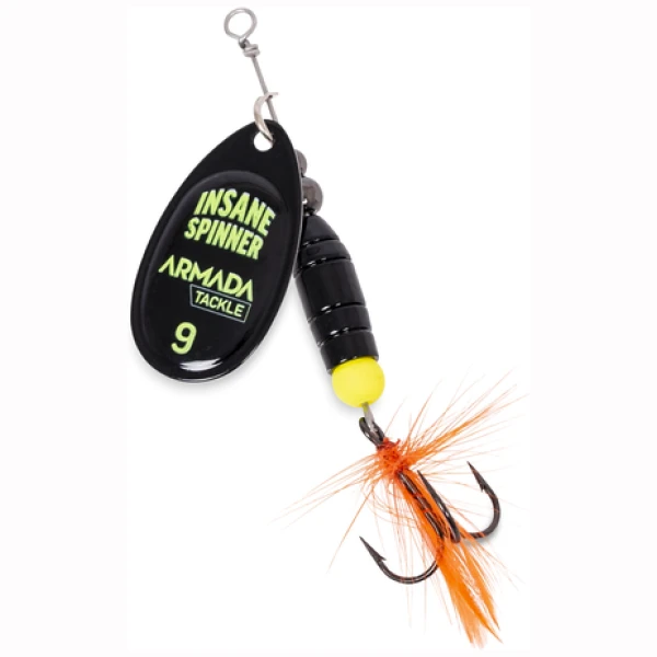 Insane Spinner kaster langt med sin kompakte kropp. Perfekt når du virkelig vil nå ut til de vakende fiskene. De relativt store og brede bladene skaper virkelig kaos i vannet og sender ut signaler i alle retninger. Den sølvfargede treblekroken er fjærbelagt og blir et attraktivt huggpunkt for jaktende rovfisk