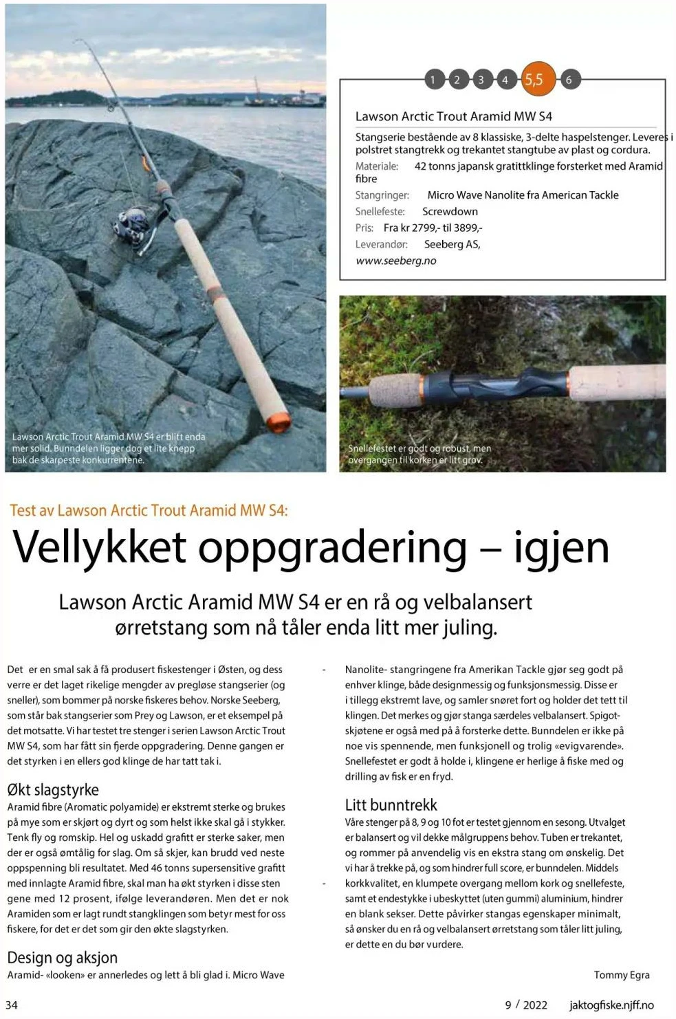 Lawson Arctic Trout Aramid S4 er en serie 3-delte reisestenger spesielt utviklet for nordisk sportsfiske etter ørret, sjøørret og lett laksefiske. Stengene er bygd på en spenstig klinge av 46T karbon og forsterket med aramidfiber for økt styrke og holdbarhet. Med MicroWave Nanolite-ringer, skrufeste med gummikork og førsteklasses håndtak av kork/EVA, gir stengene både presisjon og komfort.