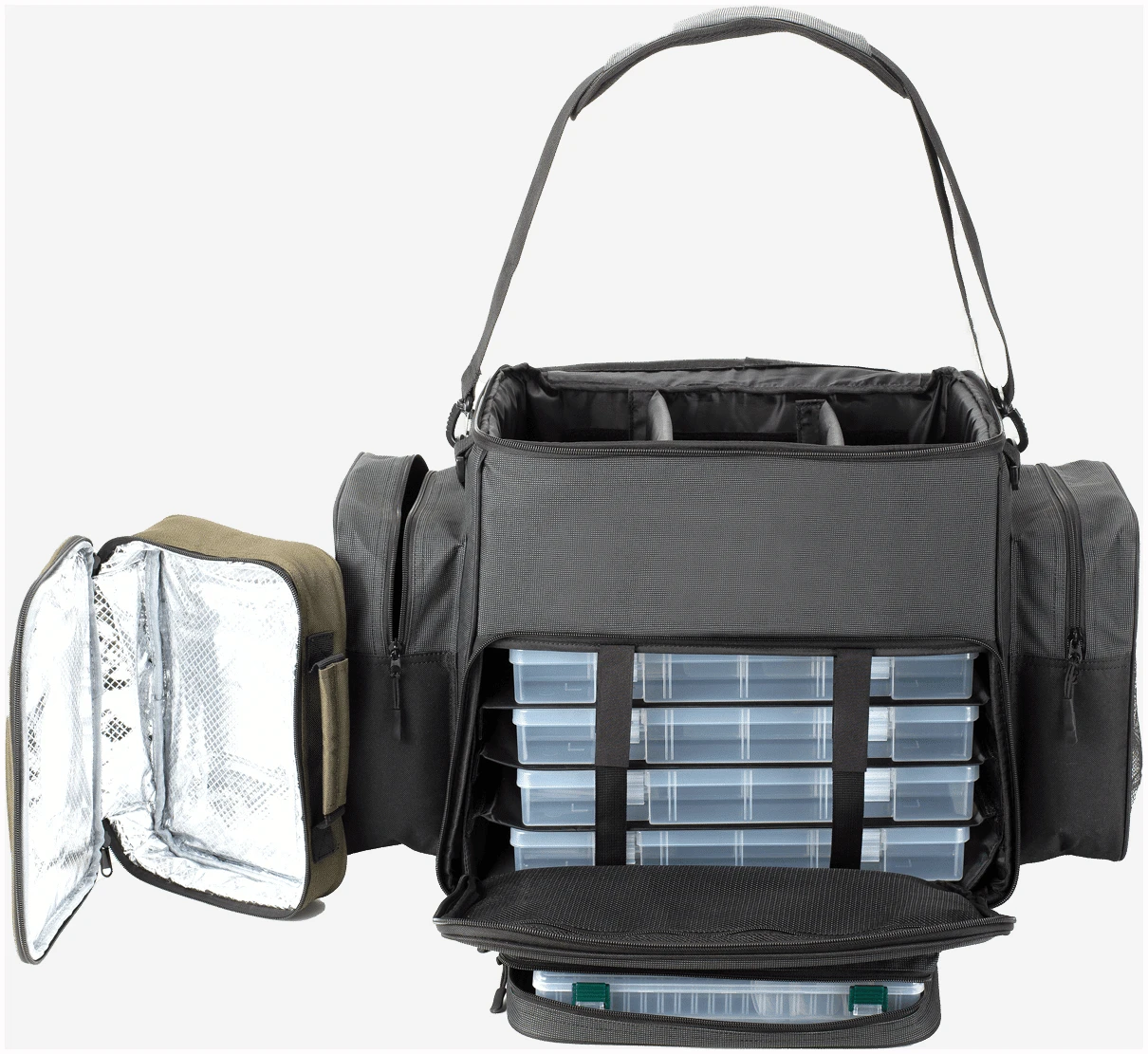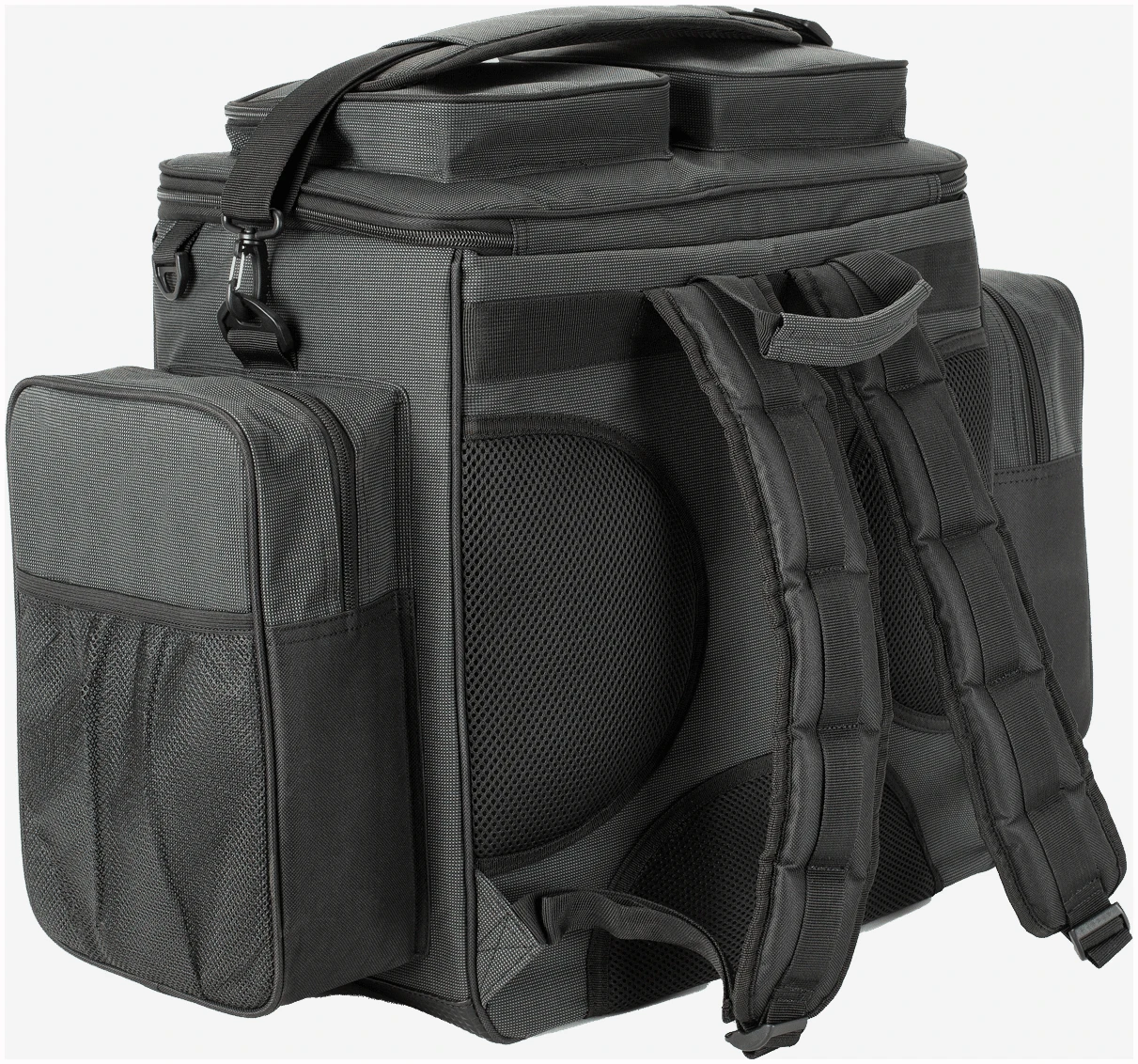 Bagen har et justerbart ryggbæresystem med polstring, avtakbar skulderreim og komfortabelt bærehåndtak. Med fire 3700-bokser i hovedrommet, egne topp- og sidelommer samt integrert kjølebag til agn eller mat, er dette en komplett og gjennomtenkt fiskeveske for både korte og lange turer.