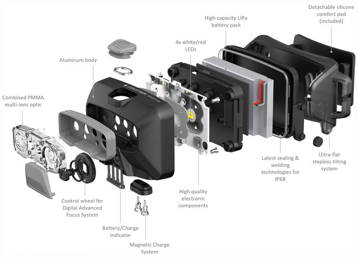 Slank, oppladbar hodelykt med tre lysstyrkenivåer og rødt frontlys.