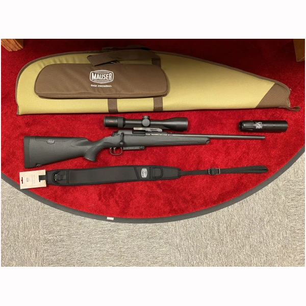 Komplett jaktpakke fra Mauser i .308 Win – Inkluderer Mauser 25 Extreme straight-pull rifle, Minox RS4 2,5–10×50 kikkertsikte, A-Tec V2 lyddemper, Mauser Picatinny skinne, Mauser våpenfutteral og riflereim.