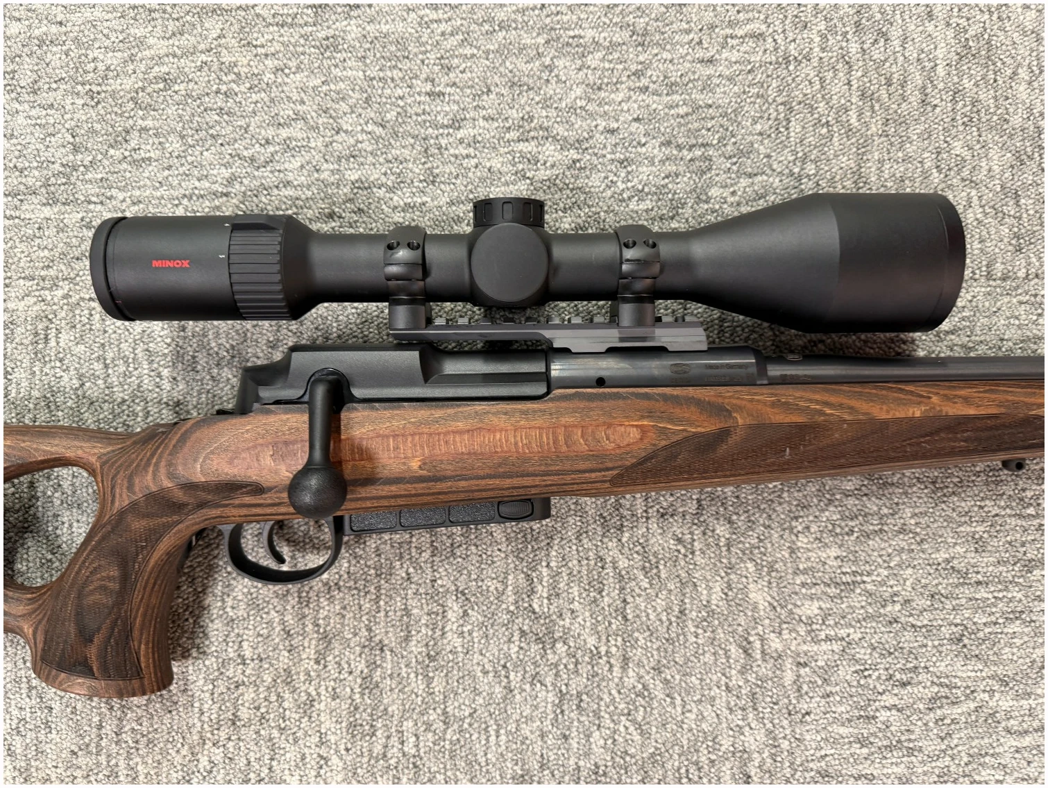 Riflen er utstyrt med laminatstokk med tommelhullgrep, som gir en naturlig håndstilling, stabil skytestilling og optimal avtrekkskontroll. Laminat gir i tillegg høy formstabilitet og god motstandsdyktighet mot fukt og temperatursvingninger.