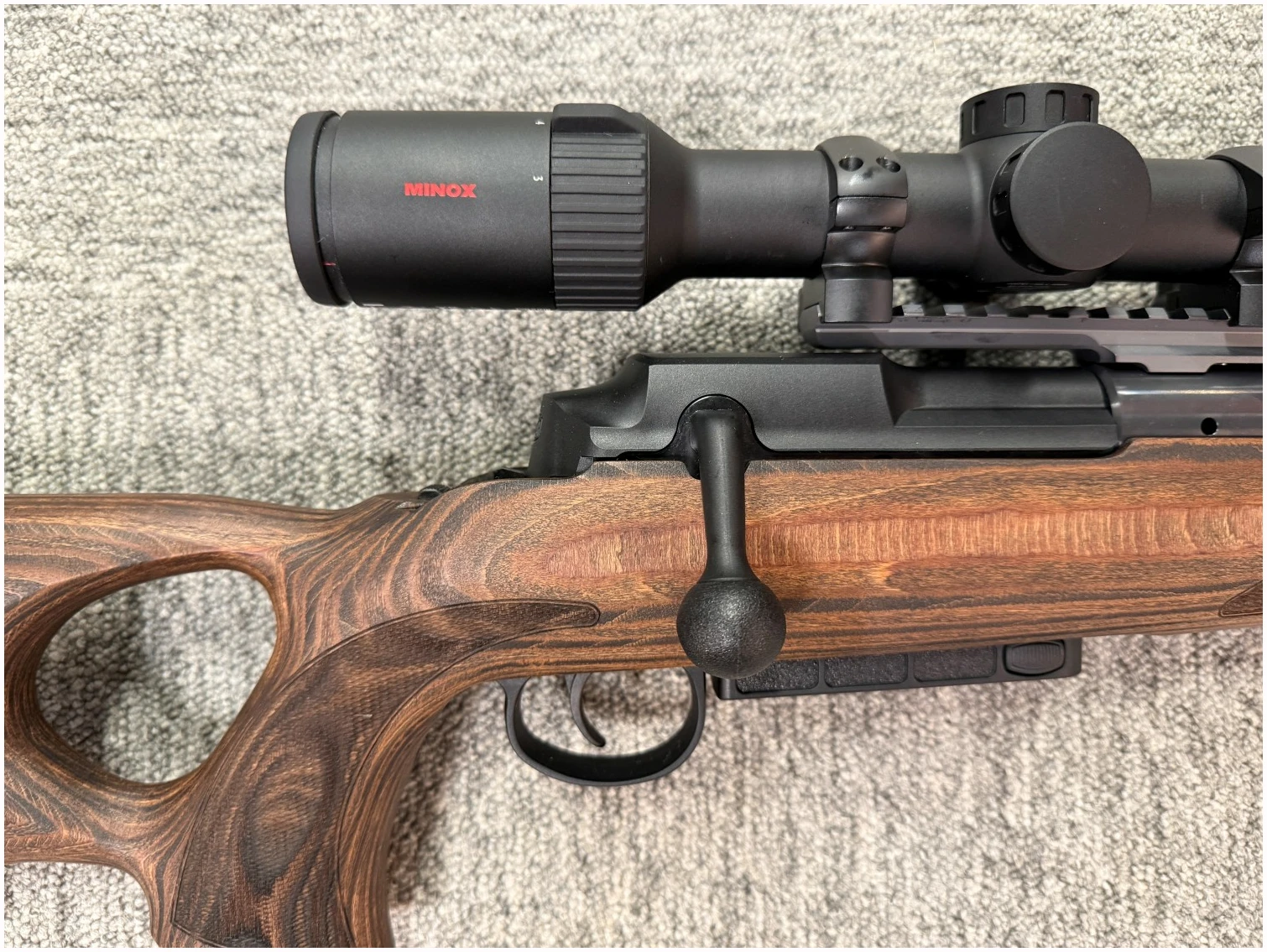 Riflen har laminatstokk med tommelhullgrep og markedets glatteste rettrekker-gange – utviklet for rask repetering, høy presisjon og trygg jakt under alle forhold.