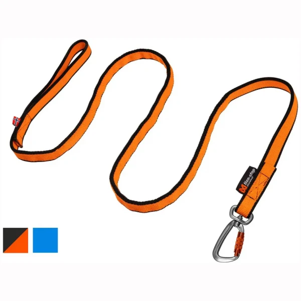 Bungee leash er tilgjengelig i to farger: oransje/svart og blå.