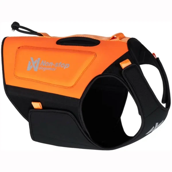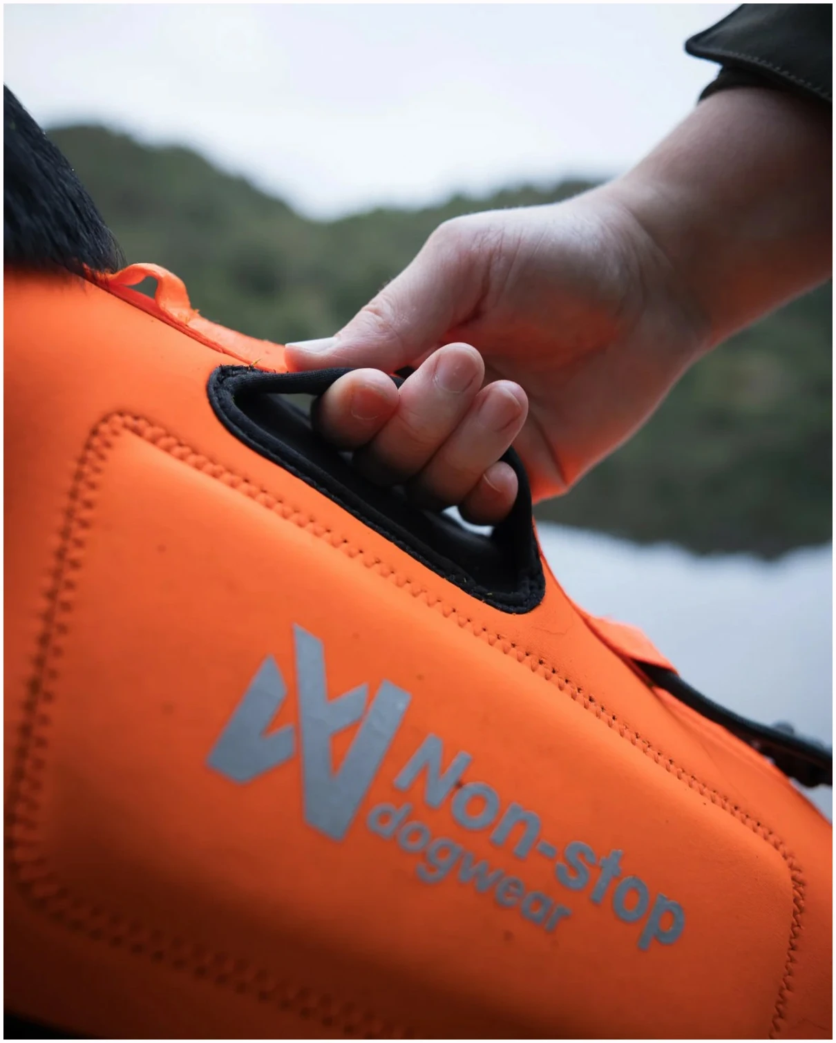 Det lavprofilerte bærehåndtaket ligger flatt når det ikke er i bruk for å hindre at det hekter seg fast, og gir godt grep ved løfting av hunden om bord i båt. Neoprenens oppdrift og skumpanelene på sidene gir ekstra støtte i vannet uten å hindre bevegelighet på land.