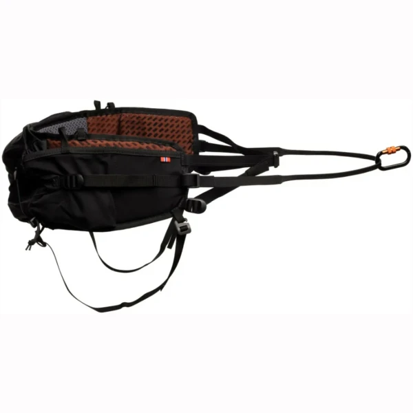 Løpebeltet kan brukes både med og uten hunden koblet til, da stroppen i front kan tas av. Hundens bånd festes i en sikker karabinkrok med skrulås. Denne er glidende og følger hundens bevegelser i terrenget. Dermed er det enklere for deg å holde balansen, da du får likt trykk på begge sider av hoftene selv om hunden trekker mot en side.