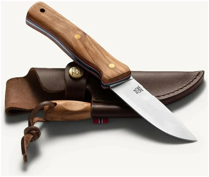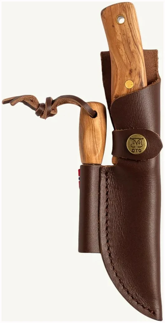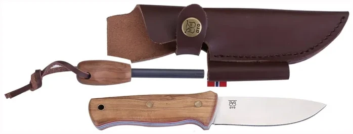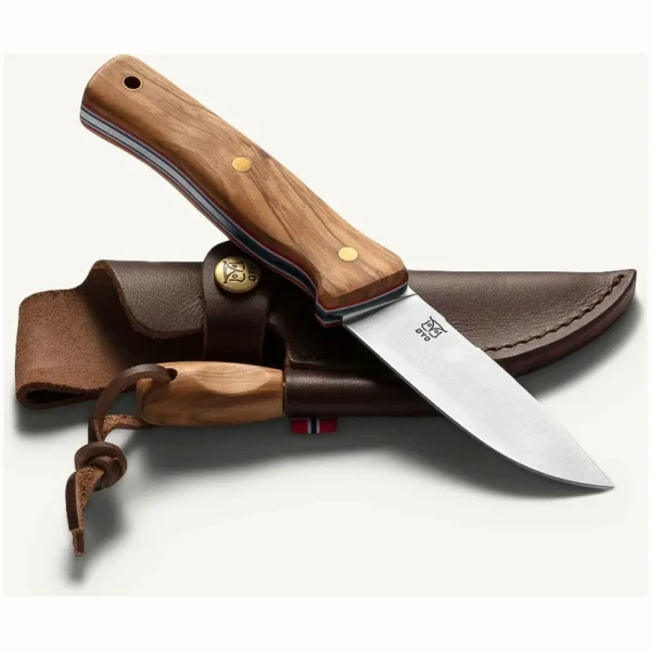 Skaftet er laget av vakkert oliventre og dekorert med linjer i fargene fra det norske flagget. Kniven leveres med en solid skinnslire som har integrert tennstål med matchende oliventre-skaft. Ryggen på knivbladet har et 90 graders felt som gjør det enkelt å lage gnister og tenne bål i felt.
