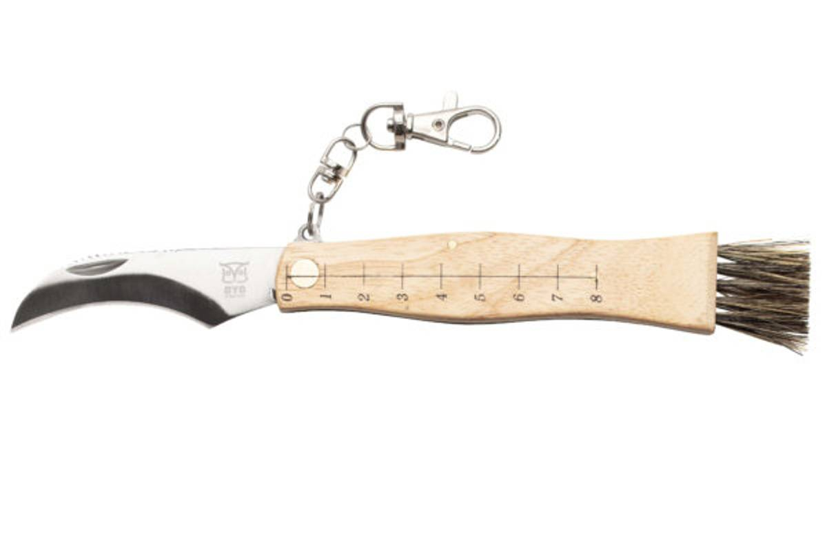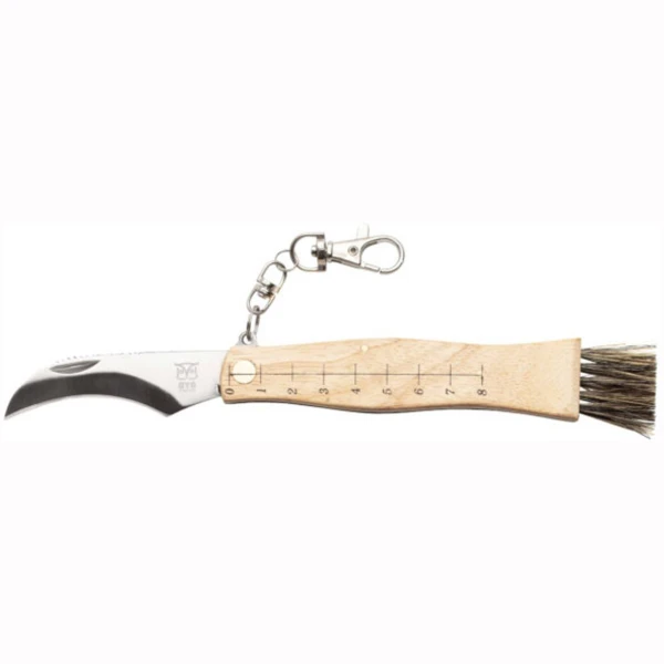 Soppturen blir litt enklere med en spesialkniv for sopp hengende på soppkurven, sekken eller i beltet. Denne foldekniven har både ett klips til å henge kniven der du måtte ønske, liten kost og en pinsett slik at man lett kan gjøre ren soppen for jord, granbar og annet rusk. Foldekniven er praktisk både ute på tur og hjemme på kjøkkenet. Det skarpe knivbladet er buet, det samme er skaftet i lyst tre. Formen på skaft og knivblad gir et godt grep som gjør det lett å skjære av soppen med en hånd.