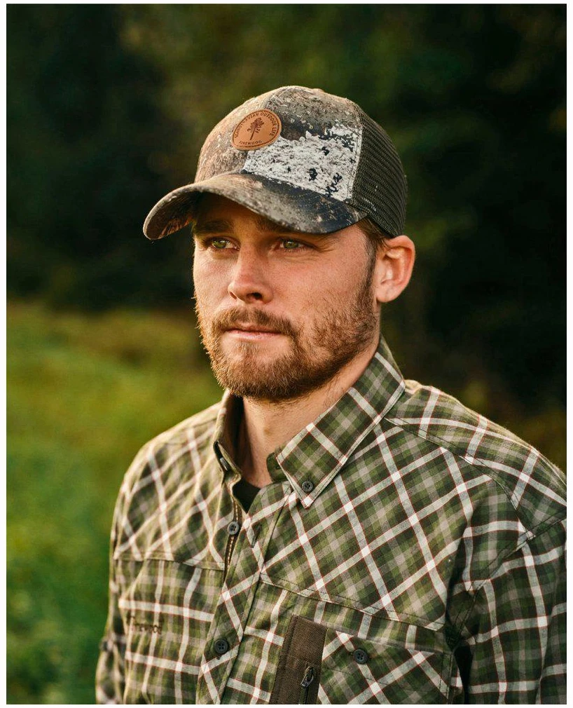 Jaktcaps med avkjølende nettingstoff bak og Pinewood®-logo i syntetisk skinn foran. Den kan justeres bak med plastspenne og er impregnert med et økologisk impregneringsmiddel som gir vannavvisende egenskaper.