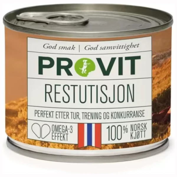 Provit Restitusjon er et tilleggsfôr fra “aktiv”-serien, spesielt utviklet for den aktive hunden. Boksen gis umiddelbart etter økten for optimal restitusjon. Kombinasjonen av propolis, kylling peptider og krill sørger for raskere restitusjon av muskler, gir hurtigere fornyelse av celler og støtter hundens ledd og immunsystem. Provit Restitusjon kan bidra med å både opprettholde- og øke muskelmassen til hunden.