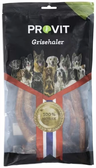 Provit Grisehaler er et 100% naturlig tygg til hunden. Grisehalene er lufttørket, uten noen form for tilsetningsstoffer. Provit Grisehaler er produsert i Norge, fra norske råvarer og er et 100% rent naturprodukt. Dette er et naturlig alternativ til behandlede tyggebein. Høy kvalitet på råvarer gir god smakelighet, derfor er dette et populært tygg til hunden.