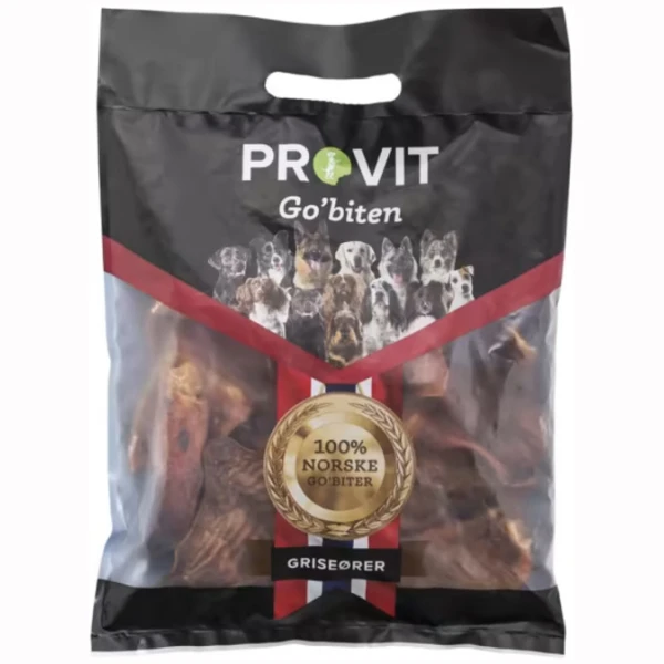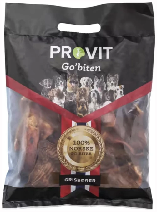 Provit Griseører er et 100% naturlig tygg til hunden. Griseørene er lufttørket, uten noen form for tilsetningsstoffer. Provit Griseører er produsert i Norge, fra norske råvarer og er et 100% rent naturprodukt. Dette er et naturlig alternativ til behandlede tyggebein. Høy kvalitet på råvarer gir god smakelighet, derfor er dette et populært tygg til hunden. Griseører har kun 8% fett og kan derfor gis til hunden som ekstra kos, med god samvittighet.