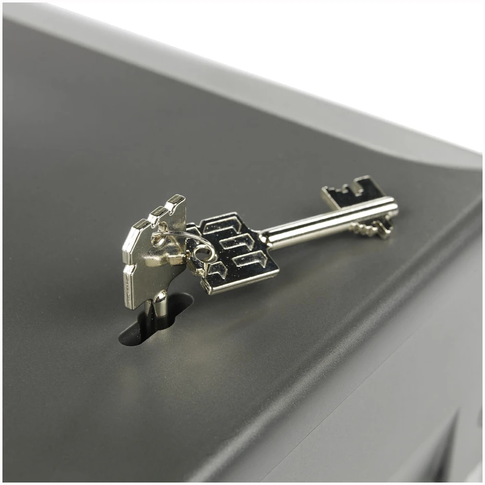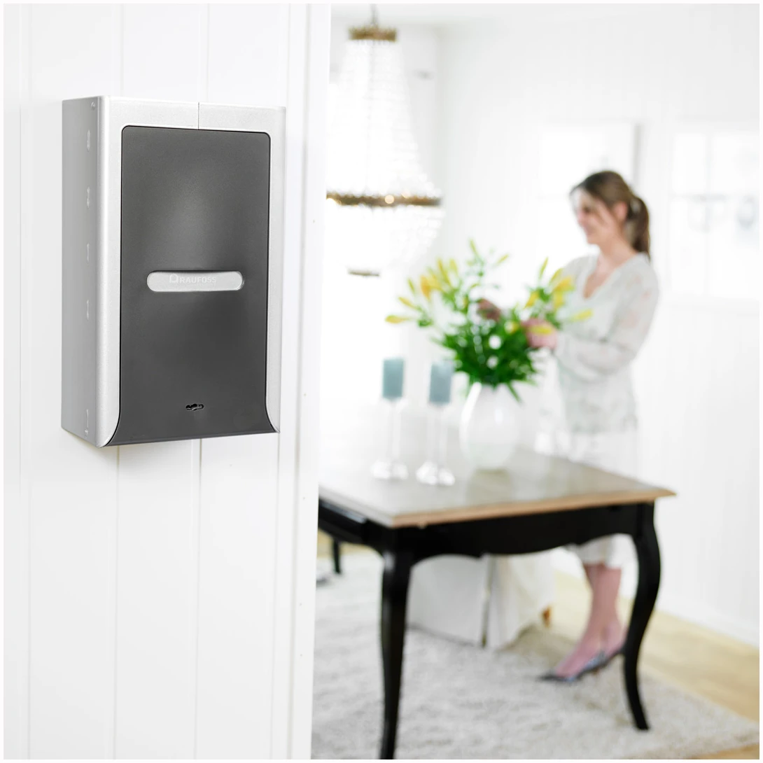 Safehouse monteres raskt og enkelt på vegg, og betjenes av en vertikal skyvedør. Døren er fjærbelastet, noe som gir god kontroll under både åpning og lukking.