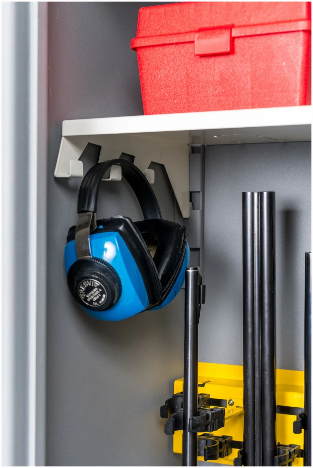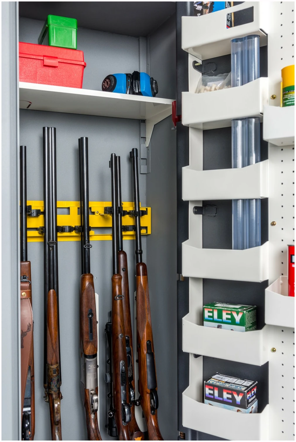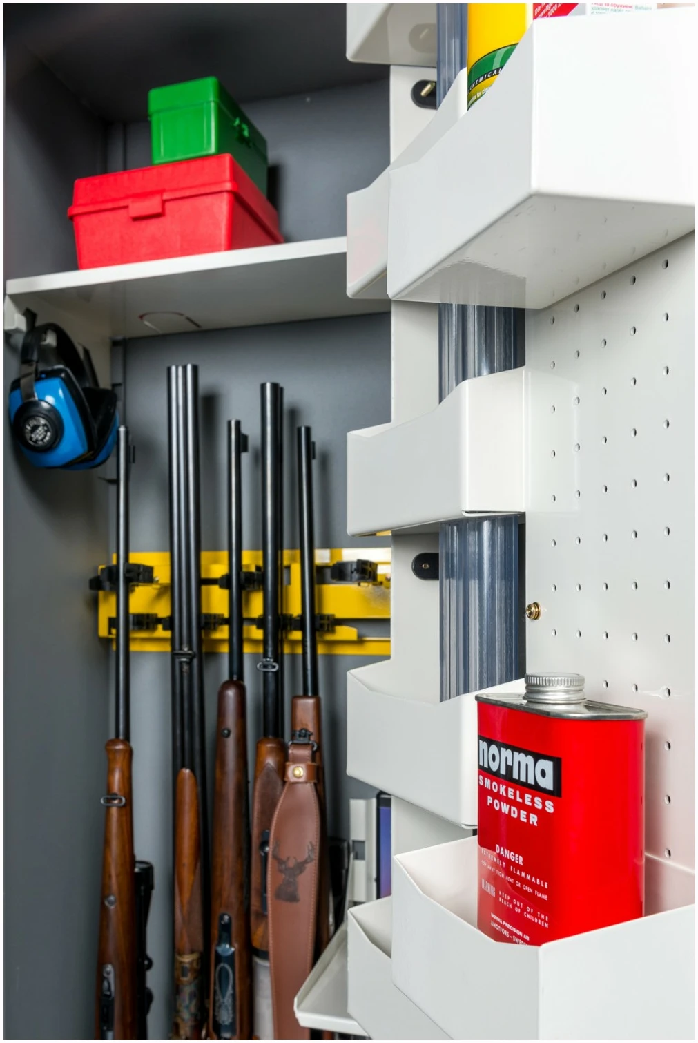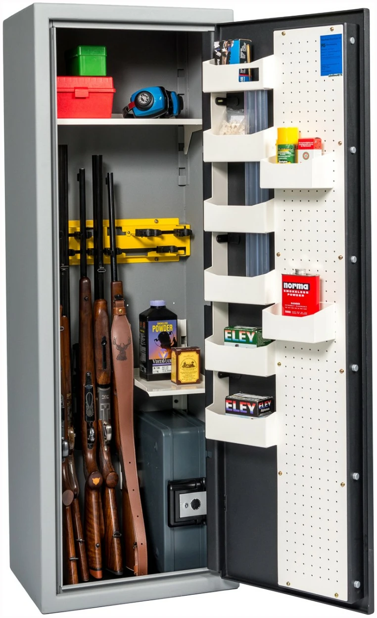 Våpenskapene er ekstra høye og har utvendige hengslet dør. Dette gir god tilgang og plassutnyttelse, samt forenkler håndtering og flytting ved at døren kan tas av. Døren har 6 stk integrerte hyller og ekstraløp-holder for systemvåpen. Den kommer også med en praktisk verktøyvegg hvor det er mulig å skru opp dørbokser eller annet utstyr du har behov for i ditt våpenskap.