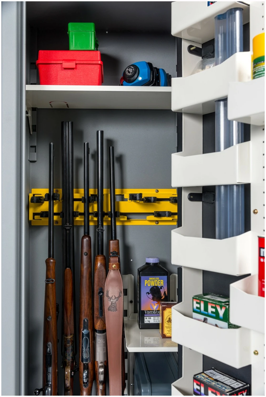 Raufoss Premium 16 våpenskap kan tilpasses med ekstra dørbokser, topphylle, sidehyllesett og lange løpstøtter.