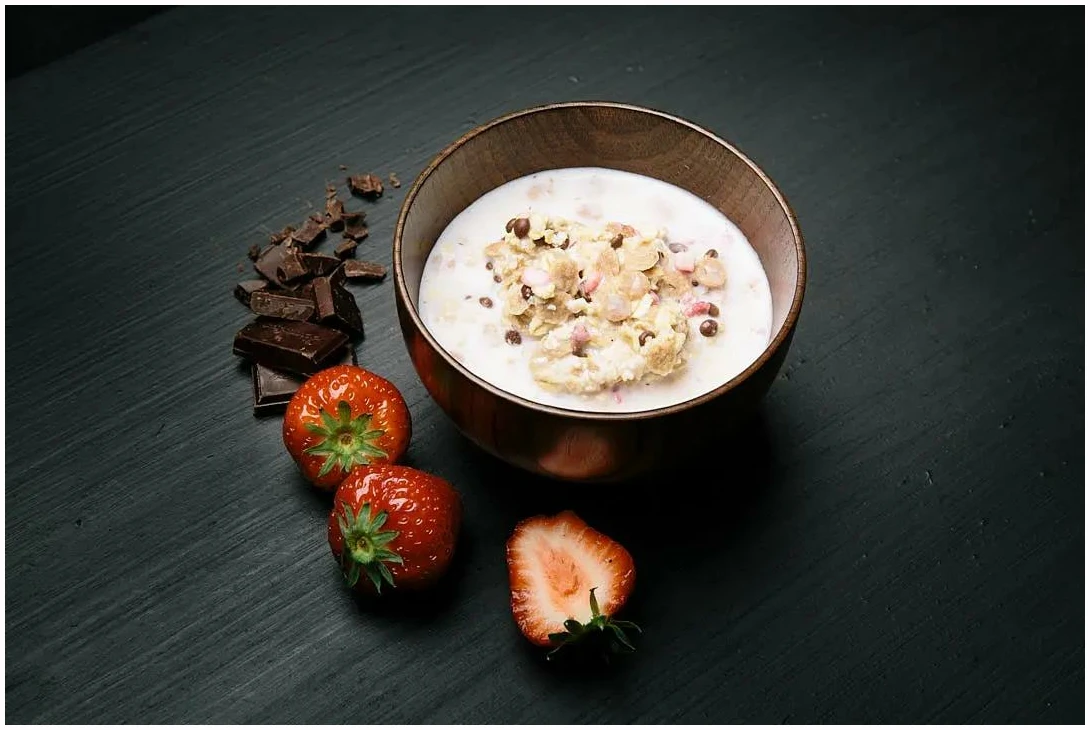Sjokolademüsli med mørk sjokolade og jordbær. Kan blandes med både kaldt og varmt vann.