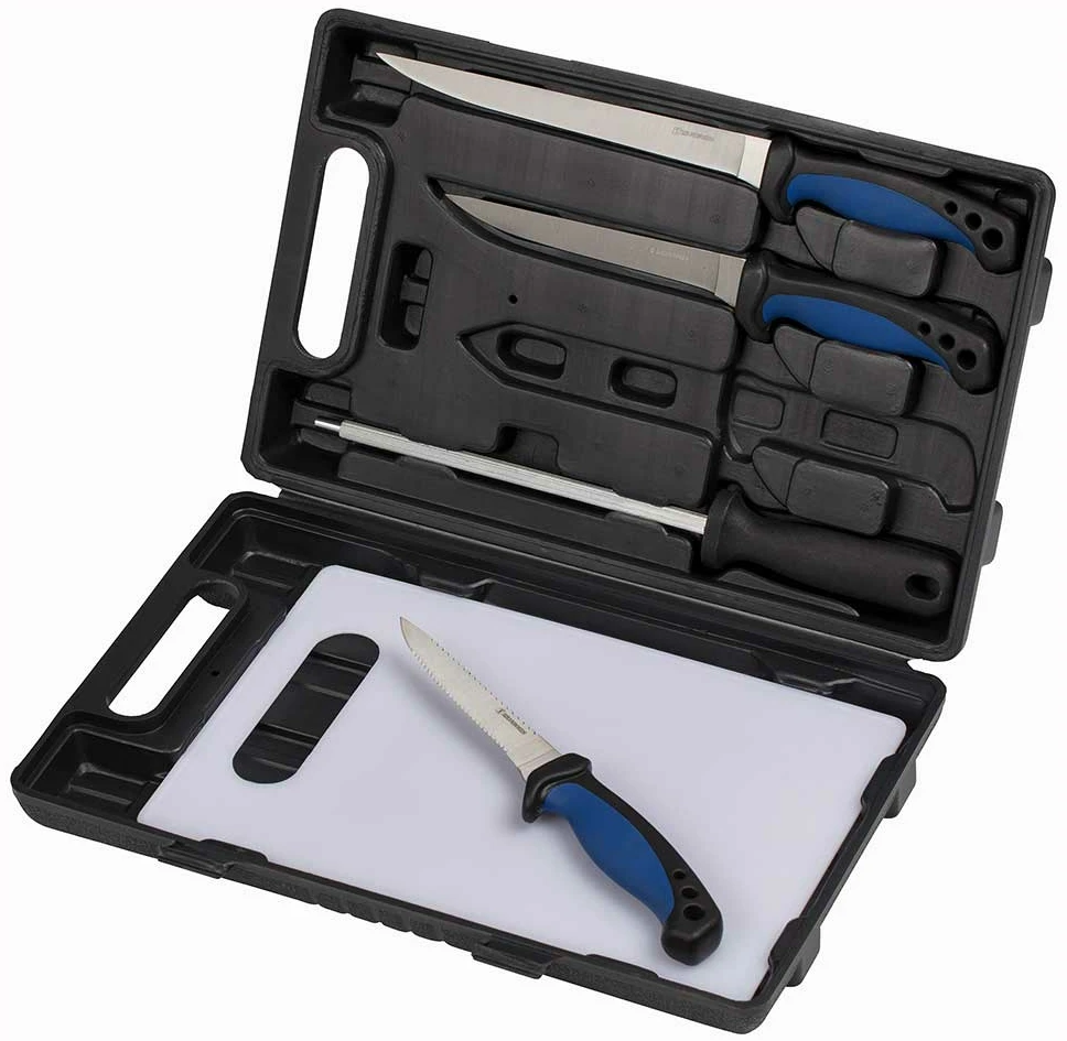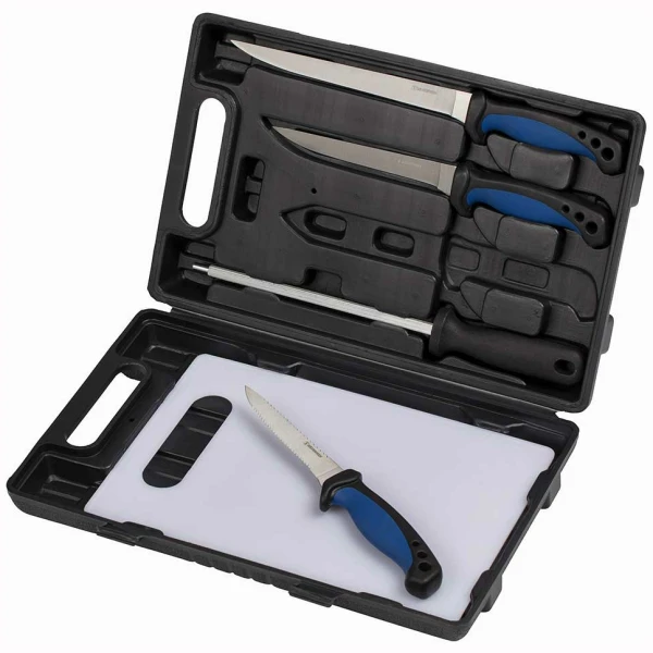 I settet følger det også med et anvendelig slipestål og et praktisk skjærebrett. Dette brettet passer ypperlig til filetering av mindre fisk og er også praktisk til kutting av agn. Praktisk og svært robust knivsett.