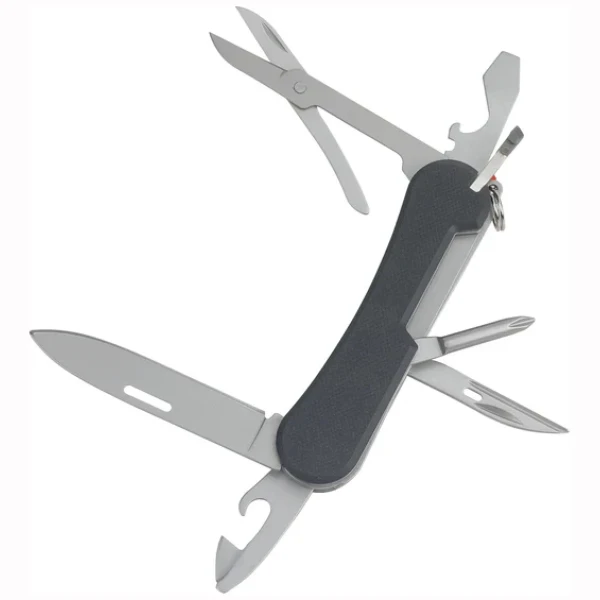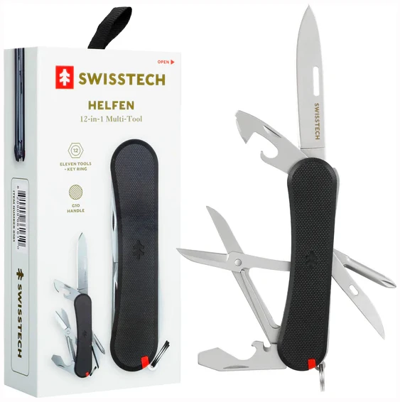 Swisstech Helfen 12-i-1 Multiverktøy er et kompakt og solid multitool med 12 funksjoner samlet i ett praktisk verktøy. Med slitesterkt G10-håndtak, skarpt drop-point blad og lav vekt på kun 85 g er det perfekt som EDC-verktøy til tur, reise, verksted eller små reparasjoner.