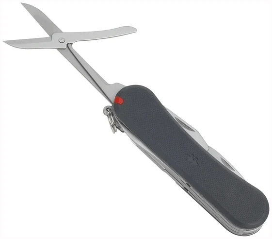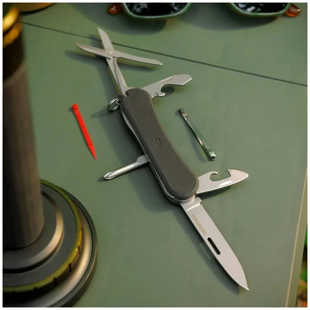 Multiverktøyet er utstyrt med et ergonomisk G10-håndtak som gir et sikkert og komfortabelt grep – selv i våte eller krevende forhold. G10 er kjent for sin styrke, slitestyrke og lave vekt, noe som gjør verktøyet både robust og lett å bære.