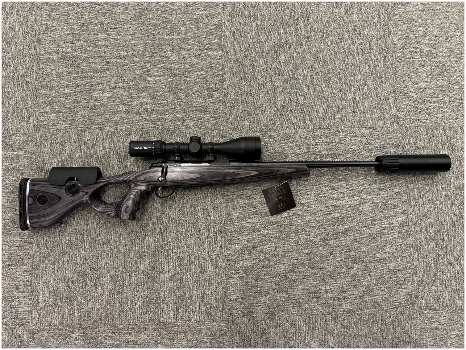 Komplett våpenpakke med Tikka T3x i .308 Win, GRS Nordic Wolf-stokk, Sabre 3–12x56i kikkertsikte, A-TEC V2 demper og Scandium montasje – ferdig montert og skyteklar.