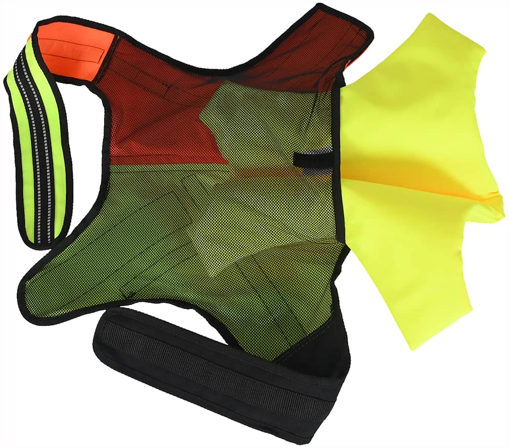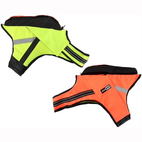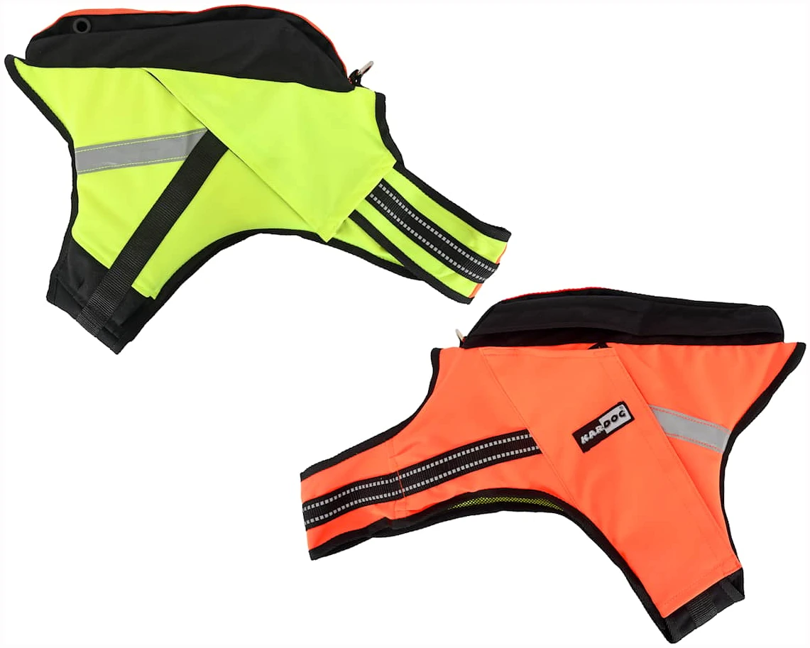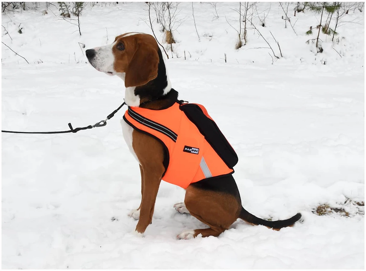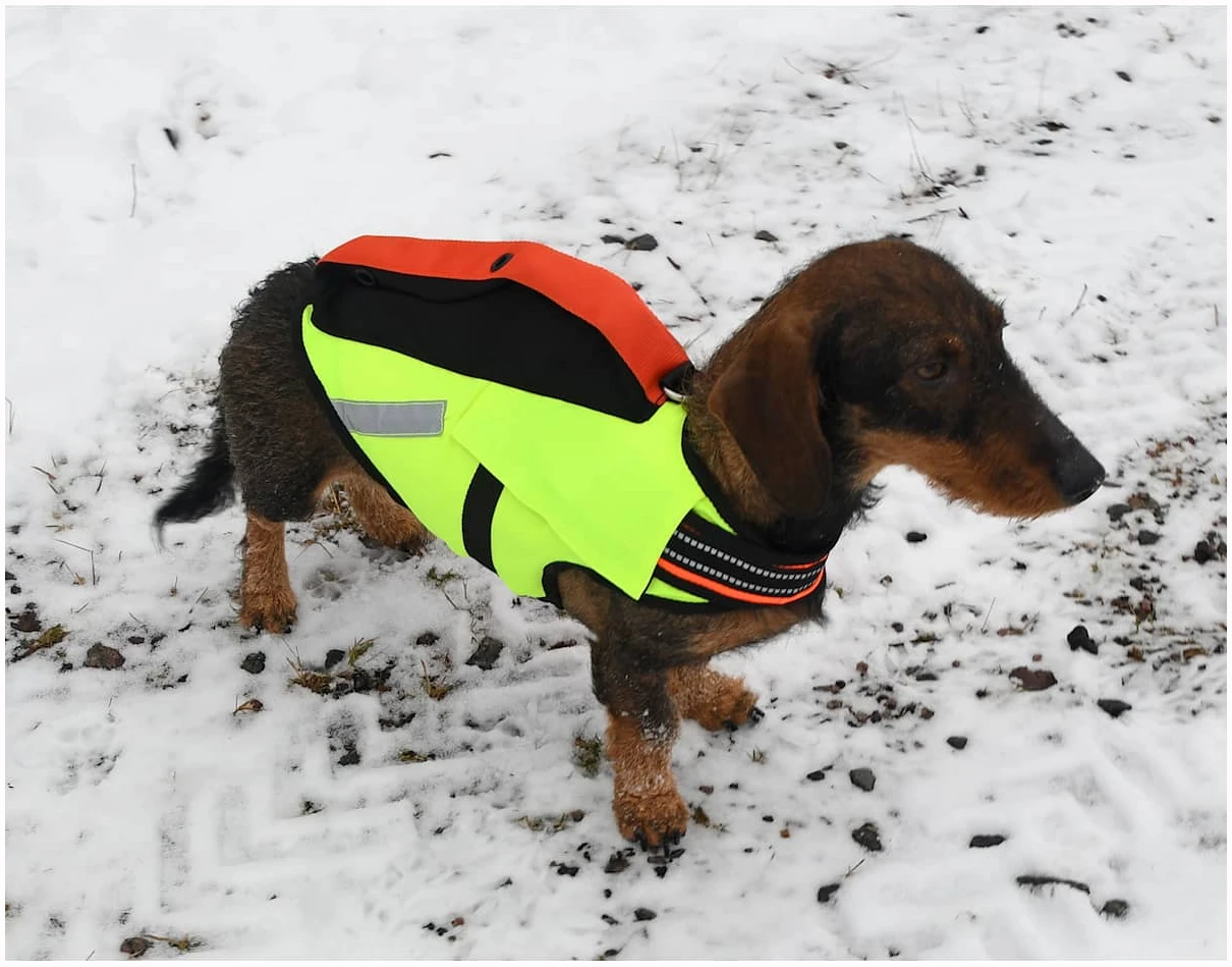 Vesten er Oransje på ene siden og gul på den andre siden for lettere å se hvilken vei hunden står i skogen.