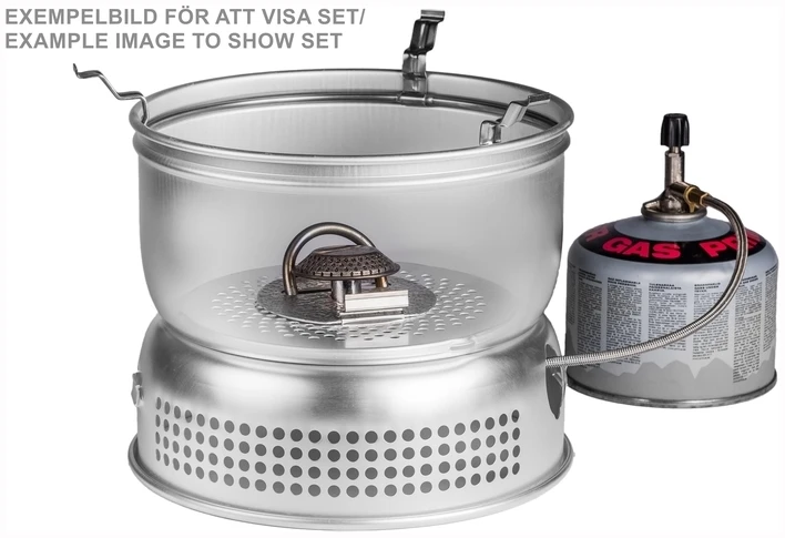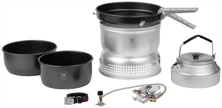Trangia 25-6UL/GB Stormkjøkken Stort med gassbrenner. Inneholder 2 kjeler og stekepanne i non-stickbelagt aluminium. Kaffekjele og vindskjerm i aluminium.